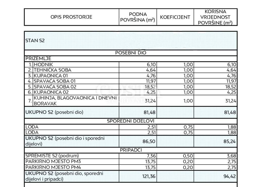 Prodaje se stan u izgradnji u Diklu u Zadru. Stan površine 81,48 m2 nalazi se na katu manje stambene zgrade sa tri jedinice u ekskluzivnom kompleksu luksuzne novogradnje. Sastoji se od dnevnog boravka, kuhinje i blagovaonice, dvije spavaće sobe, dvije kupaonice, te dvije lođe od dodatnih 2,51 m2 i 2,51 m2. Stanu pripada i spremište od 7,36 m2, te dva vanjska parkirna mjesta. Ukupna korisna površina stana zajedno sa svim pripacima iznosi 121,36 m2 (K.V. 94,42 m2).