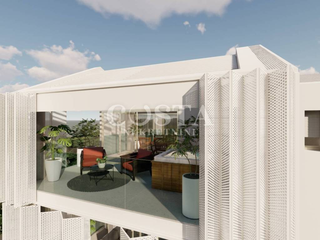 U izgradnji su korišteni visokokvalitetni materijali poput termoizolacije na fasadi te aluminijske stolarije s ugrađenim elektroroletnama i komarnicima. Stan je opremljen protupožarnim i protuprovalnim vratima. Za podne obloge korištene su keramičke pločice prve klase, a podno grijanje na vodu provedeno je u čitavom stanu putem dizalica topline. Stan je kompletno klimatiziran putem stropnih klima.