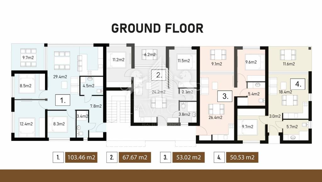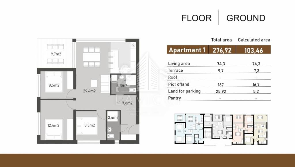 Apartman oznake S-1 nalazi se u prizemlju zgrade. Ukupna tlocrtna površina iznosi 84m2, a sastoji se od ulaznog dijela (hodnika), 3 spavaće sobe, kupaonice s toaletom, gostinjskog wc-a, otvorenog dnevnog dijela u kojem su smješteni kuhinja s blagovaonicom i dnevni boravak, te natkrivena terasa. Posebna prednost ovog apartmana je veliki vrt koji pruža mnoštvo mogućnosti - od opuštanja na suncu, vrtnog roštilja, postavljanja hidromasažne kade ili vlastitog zelenog kuta. Ispred zgrade predviđena su dva parkirna mjesta.