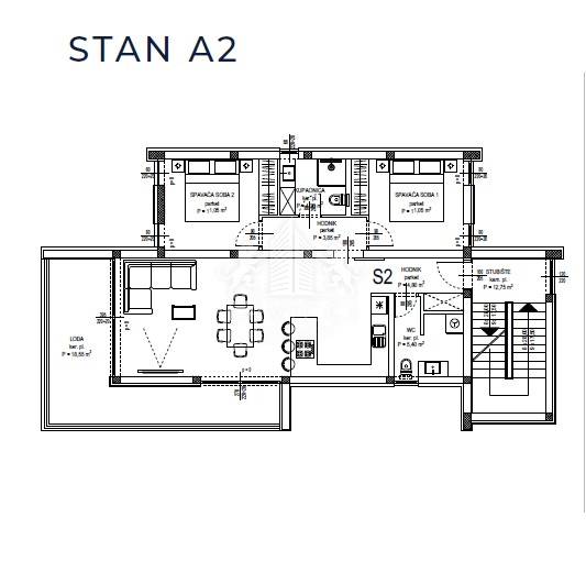 Apartman oznake A2, ukupne stambene površine 93,93 m2, sastoji se od dnevnog dijela s kuhinjom, blagovaonicom i dnevnim boravkom, dvije spavaće sobe, kupaonice s toaletom, gostinjskim toaletom s vešerajem i loggie površine 18,55 m2.