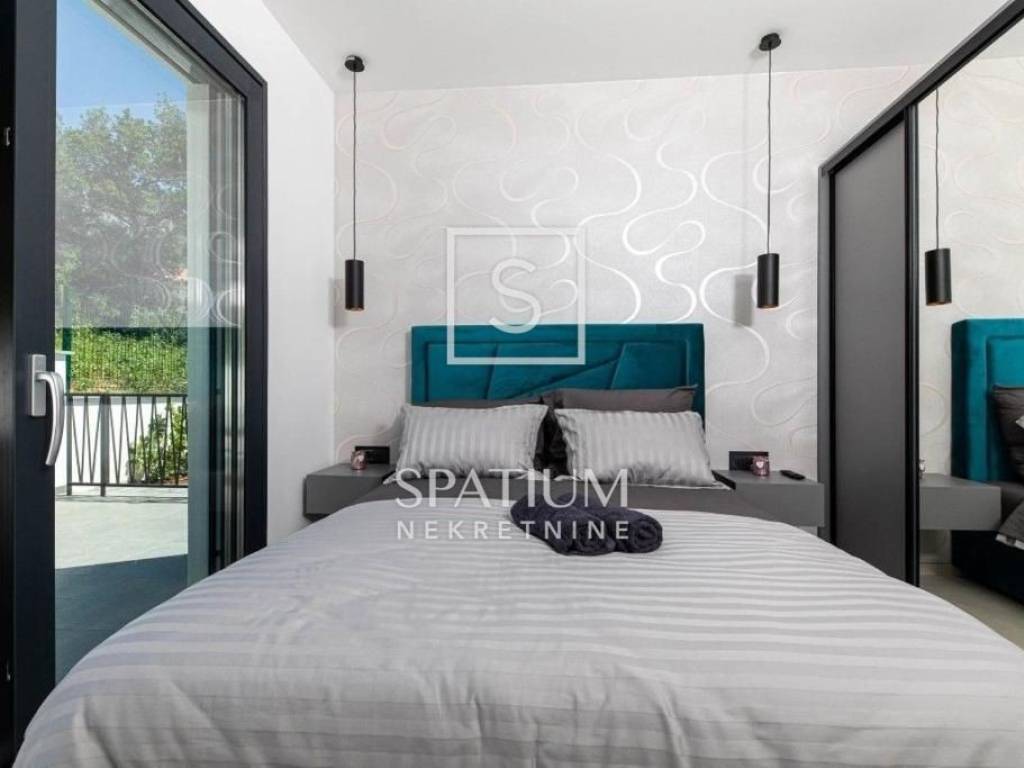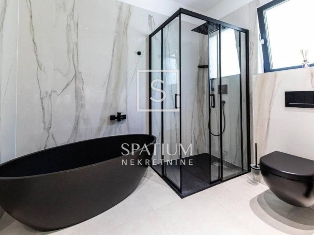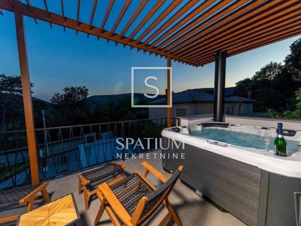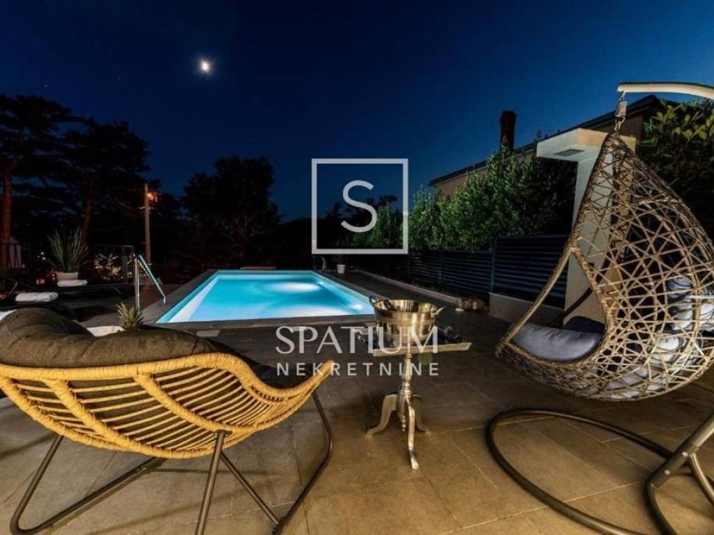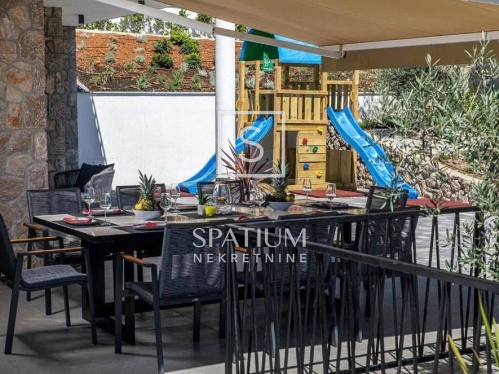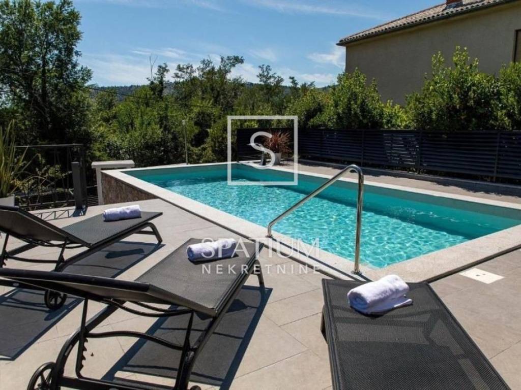 BRIBIR, u ponudu smo dobili luksuznu vilu u mirnom okruženju. Potpuno uređena i moderno namještena, površine 150 m². Smještena na ograđenoj okućnici od 715 m² s grijanim bazenom, dječjim igralištem, parkingom za četiri vozila i stanicom za električno punjenje. U prizemlju kuće su kuhinja, blagovaona i dnevni boravak otvorenog koncepta s izlazom na natkrivenu grill terasu i pogledom na vanjski grijani bazen. Spavaća soba s kupaonom i posebna prostorija sa svom potrebnom tehnikom i perilicom. Unutarnje stubište vodi na kat gdje se nalaze tri spavaće sobe, dvije kupaone, sauna, mali wellness te jacuzzi na terasi. Svaka soba ima izlaz na terasu i prekrasan pogled na okolinu. Dio okućnice čini mediteranski vrt sa sustavom navodnjavanja. Ova moderna nekretnina opremljena je dizalicama topline, podnim grijanjem, centralnim usisavačem, alarmom i video nadzorom, s mogućnošću upravljanja putem pametnog telefona. Povišena i ograđena pruža intimu u potpunosti.