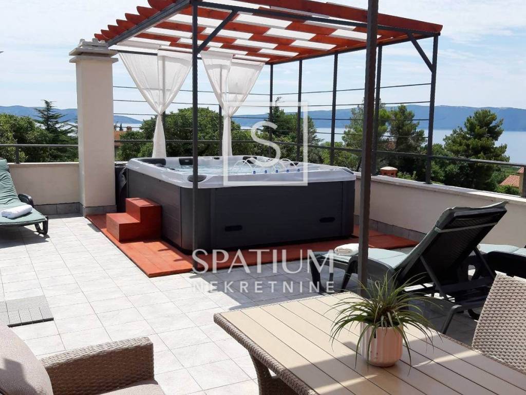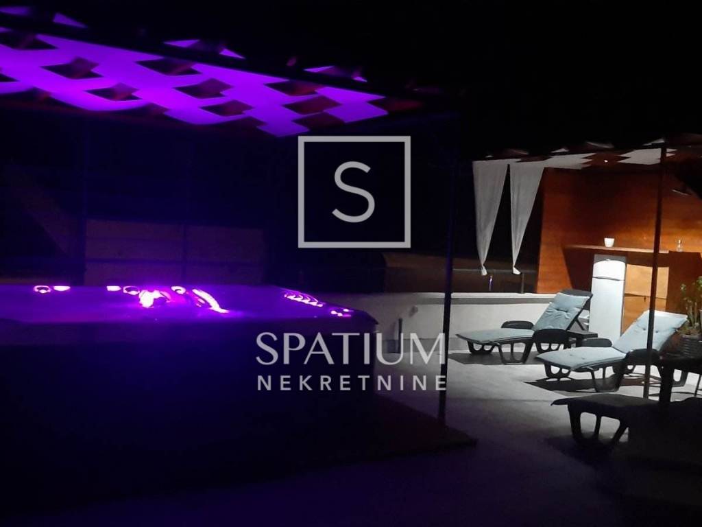 Krovna terasa površine 60 m2 s jacuzzijem za sedam osoba, solarnim tušem, vrtnim namještajem, ležaljkama i panoramskim pogledom na more prava je oaza za uživanje. Druga terasa je površine 40 m2 s grijanim bazenom i sunčalištem iza kuće nudi mogućnosti za dodatno opuštanje.