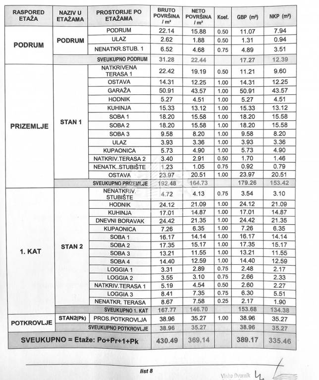 Ukupna neto stambena površina iznosi 335,46 m2, dok površina okućnice iznosi 190 m2.