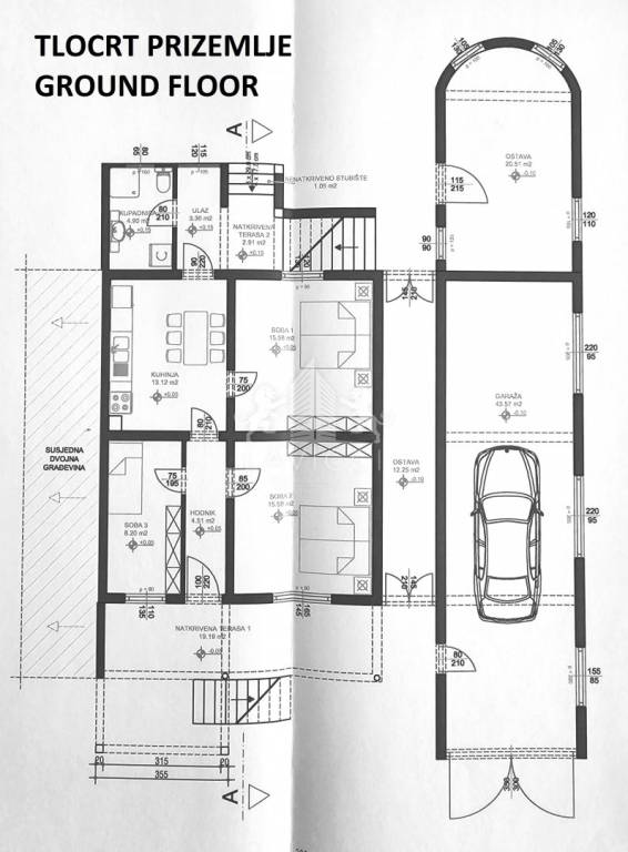 U prizemlju kuće nalaze se dvije stambene jedinice i garaža površine 35 m2. Prvi stan je veći trosoban s hodnikom, dnevnim boravkom, kuhinjom i blagovaonicom, kupaonice i natkrivene terase. Ukupna stambena površina stana iznosi 75,70 m2. Drugi stan je manji, jednosobni stan koji se nalazi u ROH-BAU izdanju, površine 40m2.