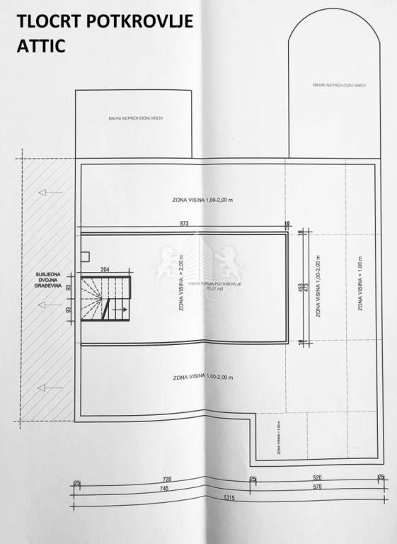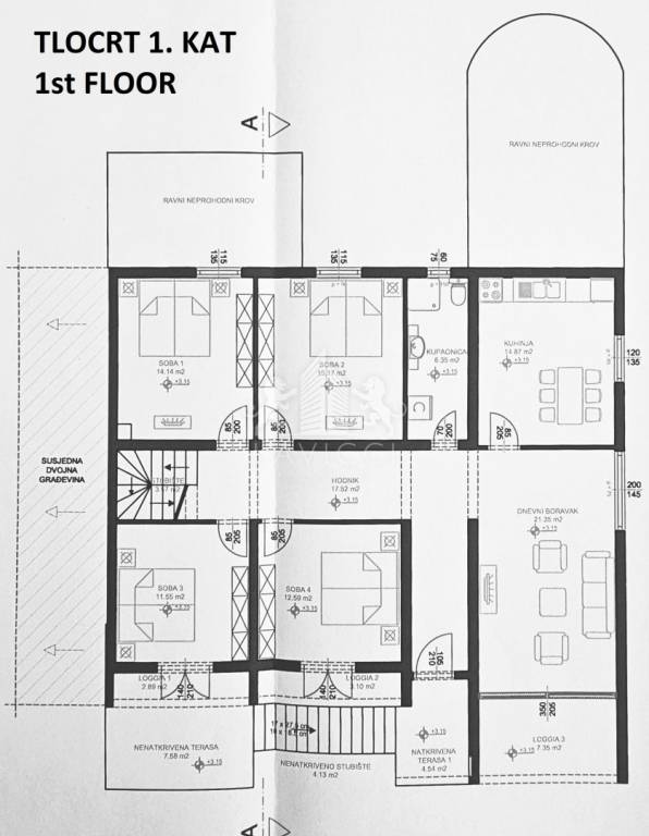 Vanjsko stubište vodi na kat na kojem je smješten extra komforan četverosoban stan ukupne površine 206m2.