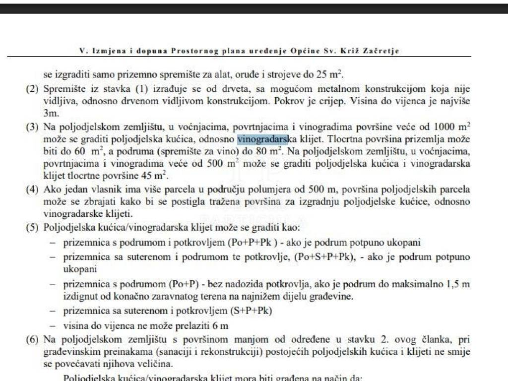Prodajemo zemljište, evidentirano kao vinograd pov. 1.604 m². Do njega vodi asfaltirani prilaz. Priključci vode i struje su u neposrednoj blizini. Vlasništvo je 1/1, bez tereta. Posjeduje uporabnu dozvolu za malu građevinu koja se na njemu nalazi. Adresa najbliže kuće je Dukovec 89D. Preko jednog dijela čestice prelazi strujni vod. Na području Svetog Križa Začretje u vinogradima je moguća gradnja sukladno skicama i fotografijama priloženom tekstualnom dijelu prostornog plana.