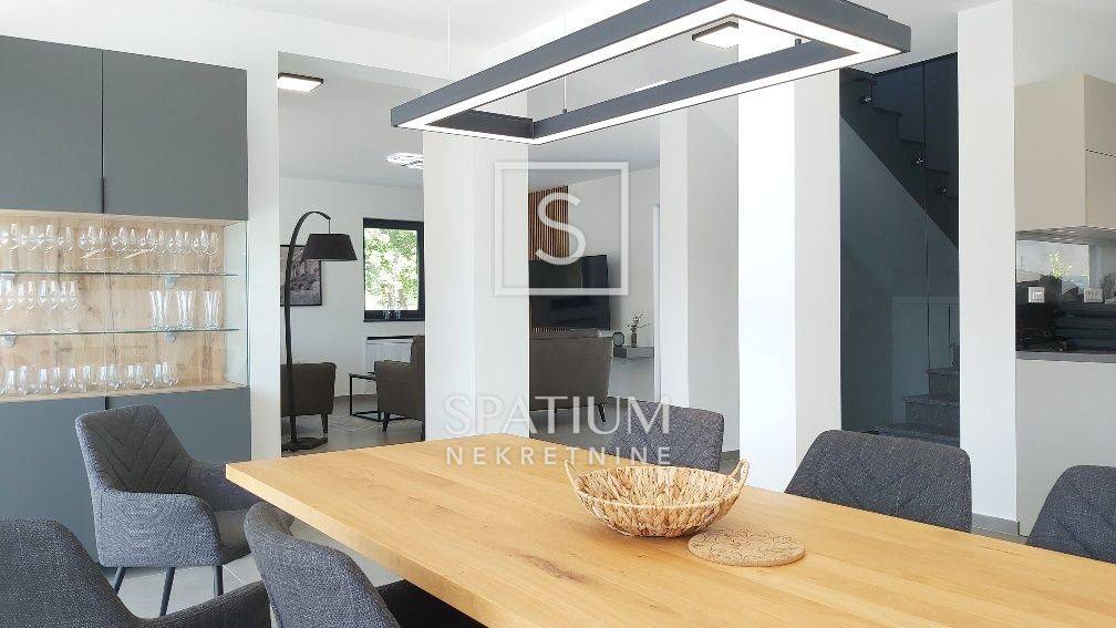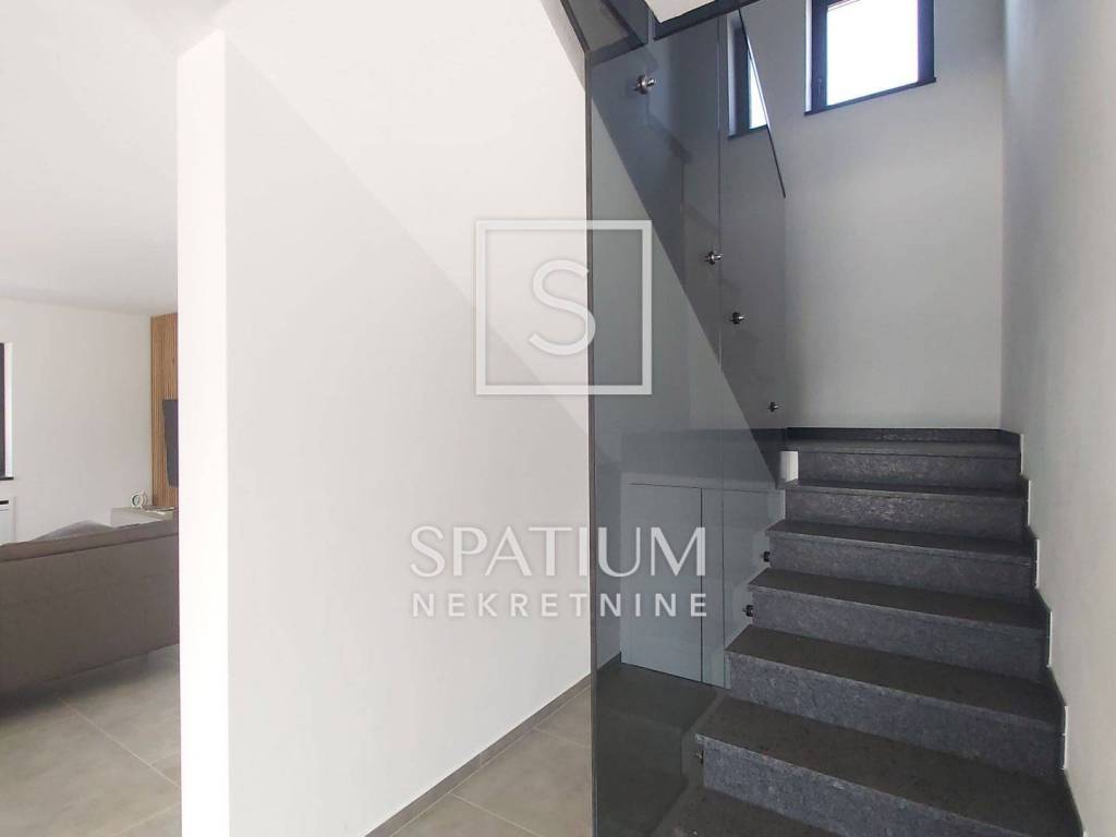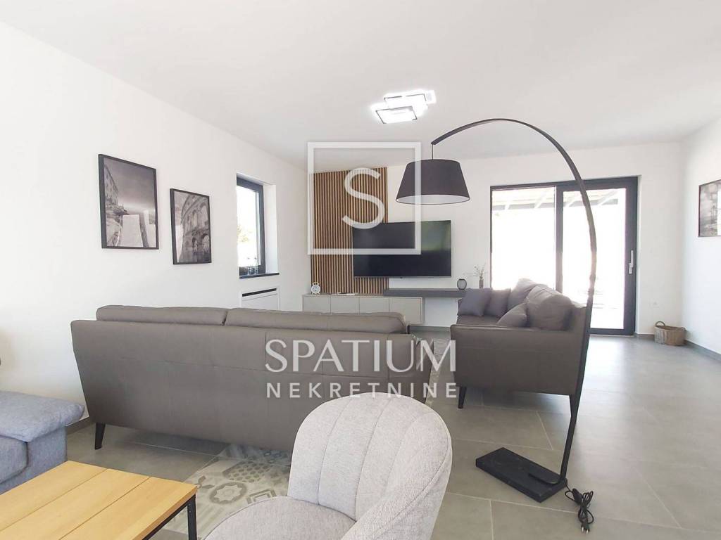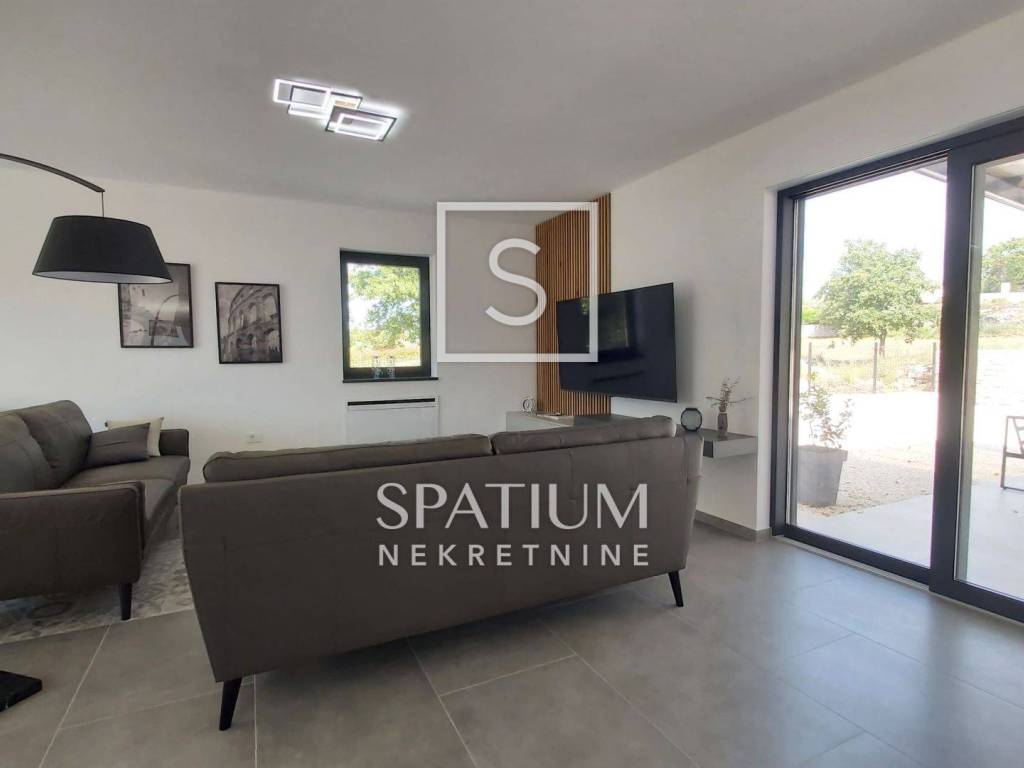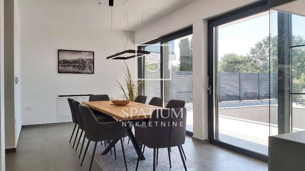SVETVINČENAT, u ponudi je moderna samostojeća vila neto površine 190 m², smještena u mirnom naselju nedaleko od povijesnog gradića Svetvinčenta. Vila je izgrađena 2023. godine na zemljištu od 714 m², a odlikuju je suvremena arhitektura, vrhunski materijali i promišljen raspored. Prizemlje uključuje prostrani dnevni boravak, blagovaonicu, kuhinju s izlazom na natkrivenu terasu predviđenu za ljetnu kuhinju, ostavu i toalet. Na katu se nalaze četiri luksuzne spavaće sobe, svaka s vlastitom kupaonicom i garderobom, dok tri sobe imaju izlaz na terasu s panoramskim pogledom na zelenilo i djelomično na more. Vila je potpuno namještena, ima aluminijsku stolariju s električnim roletama, podno grijanje putem dizalice topline, ventilokonvektore u svim prostorijama te uređeno dvorište s bazenom, sunčalištem i parkiralištem za tri vozila.