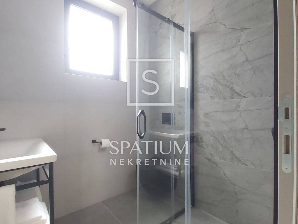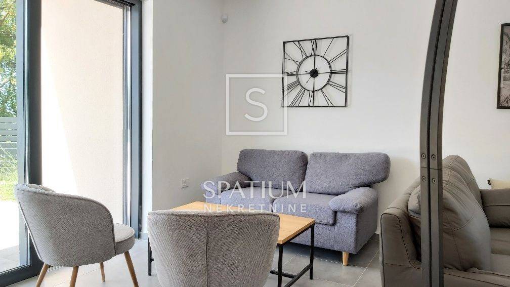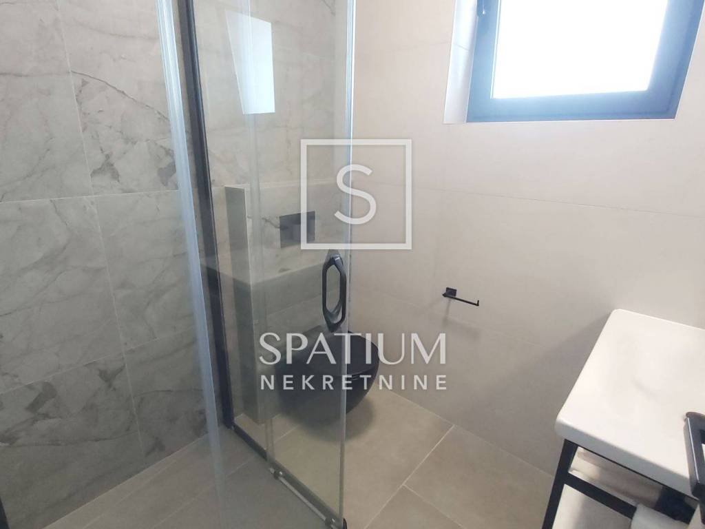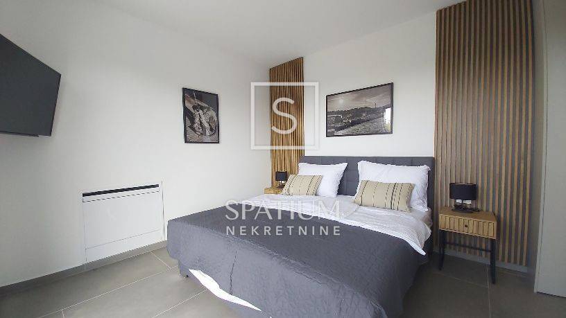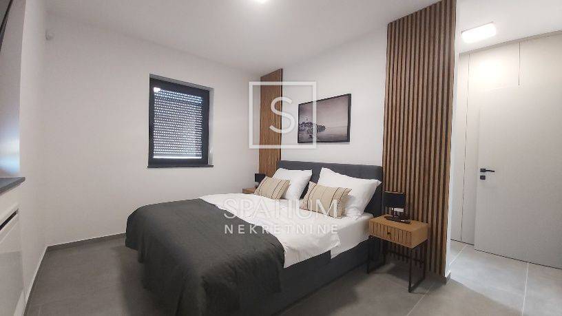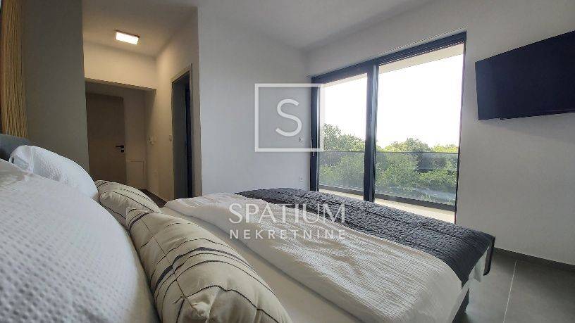 SVETVINČENAT, u ponudi je moderna samostojeća vila neto površine 190 m², smještena u mirnom naselju nedaleko od povijesnog gradića Svetvinčenta. Vila je izgrađena 2023. godine na zemljištu od 714 m², a odlikuju je suvremena arhitektura, vrhunski materijali i promišljen raspored. Prizemlje uključuje prostrani dnevni boravak, blagovaonicu, kuhinju s izlazom na natkrivenu terasu predviđenu za ljetnu kuhinju, ostavu i toalet. Na katu se nalaze četiri luksuzne spavaće sobe, svaka s vlastitom kupaonicom i garderobom, dok tri sobe imaju izlaz na terasu s panoramskim pogledom na zelenilo i djelomično na more. Vila je potpuno namještena, ima aluminijsku stolariju s električnim roletama, podno grijanje putem dizalice topline, ventilokonvektore u svim prostorijama te uređeno dvorište s bazenom, sunčalištem i parkiralištem za tri vozila.