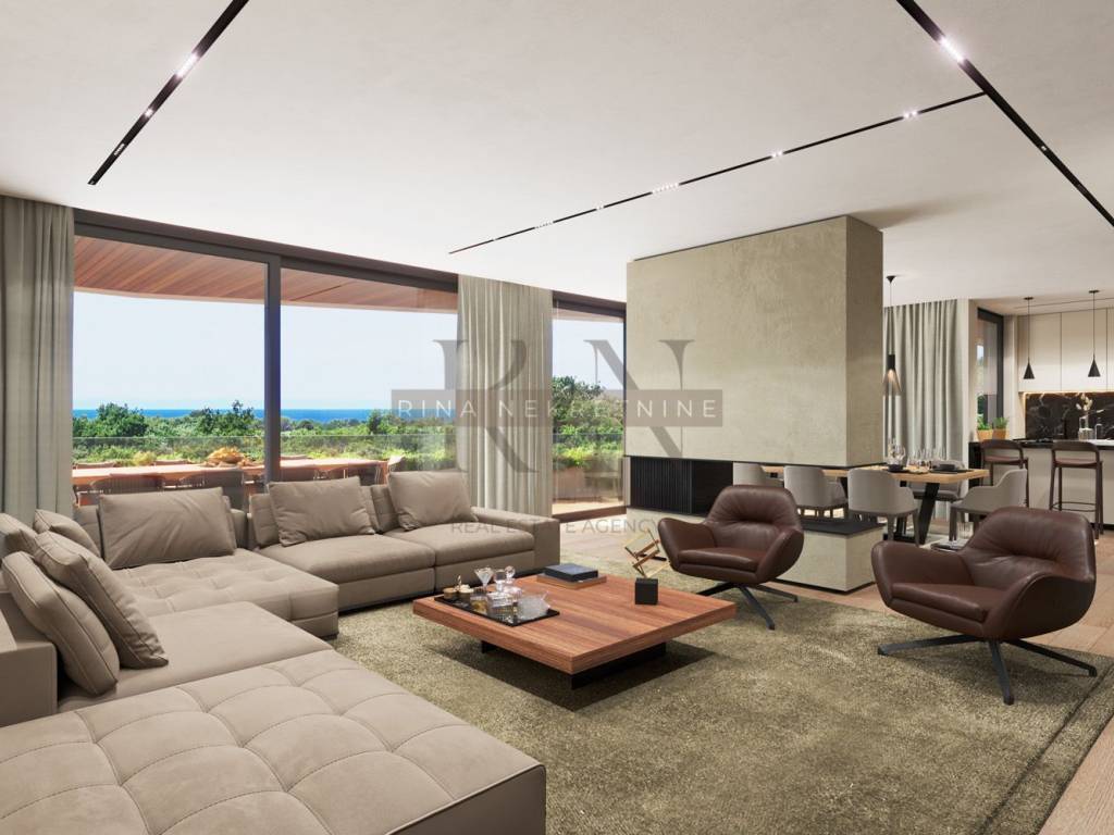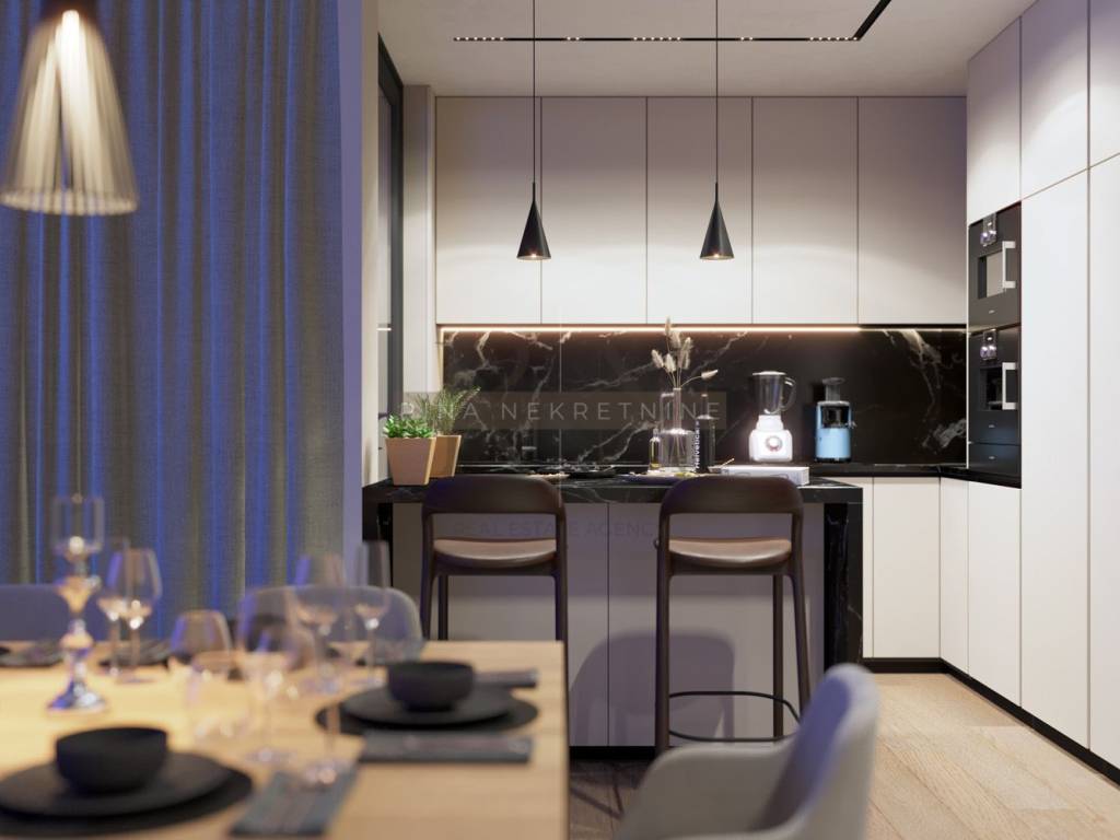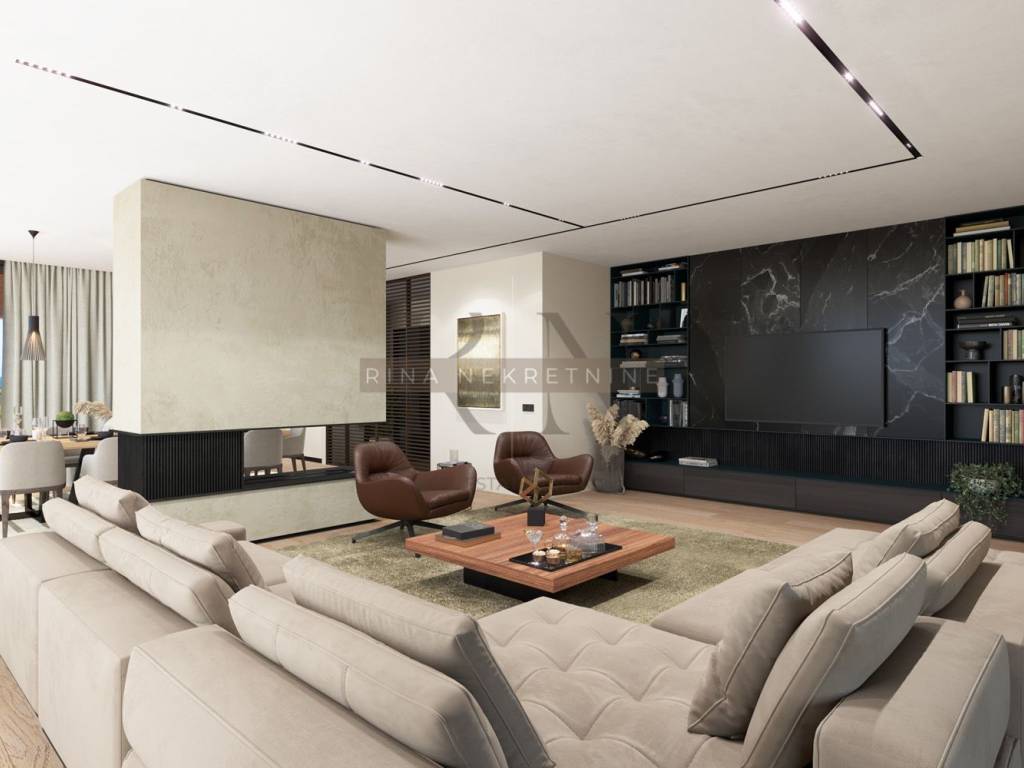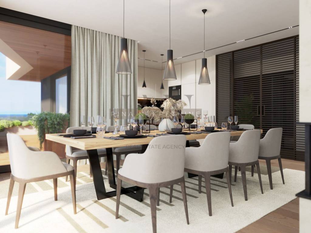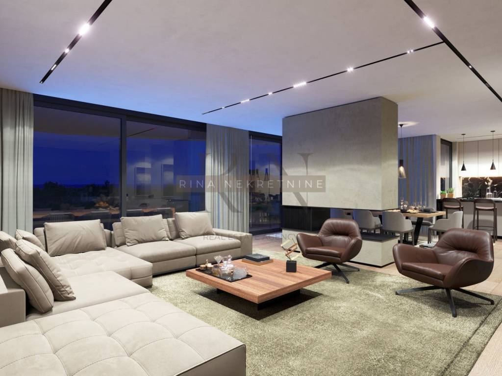 Urbana zgrada je rađena po principu A+ energetskog razreda te su upotrebljavani samo najbolji materijali i oprema. Trenutno je u samoj završnoj fazi, vlasnik je voljan prodati uređenu i neuređenu, ovisi o trenutku i volji kupca. Do samog stana dolazi se liftom te u na kat ima pristup samo vlasnik nekretnine. Penthouse se sastoji od ulaznog prostora sa gostinjskim wcom, ulazak u open space kuhinju sa blagavonicom i dnevnim boravkom kompletno okupanim pogledom na more i zelenilo pošto se kroz cijeli dnevni dio prostiru ALU, od poda do stropa, klizna vrata sa izlazom na natkrivenu terasu od 116m2 sa svojim sunčalištem, jacuzzijem i lounge zonom. Obogaćena pravim punim drvom na stropovima i indirektnom rasvjetom, na istu imaju izlaz i sve spavaće sobe pošto je orijentirana na tri strane svijeta. U penthouseu su tri spavaće sobe sa vlastitim kupaonicama i garderobom, od kojih jedna kupaonica posjeduje i vlastitu saunu vrlo laku za održavanje. Visoki stropovi i bogato uređenje, stanu daje izuzetno ekskluzivan izgled. Stanu pripadaju dva parkirna mjesta sa vlastitom punionicom te spremištem u prizemlju.