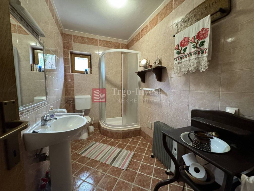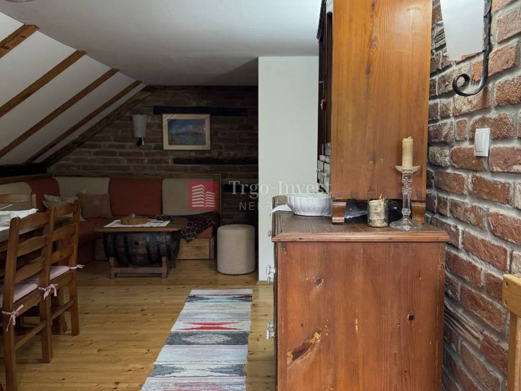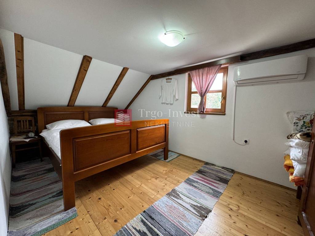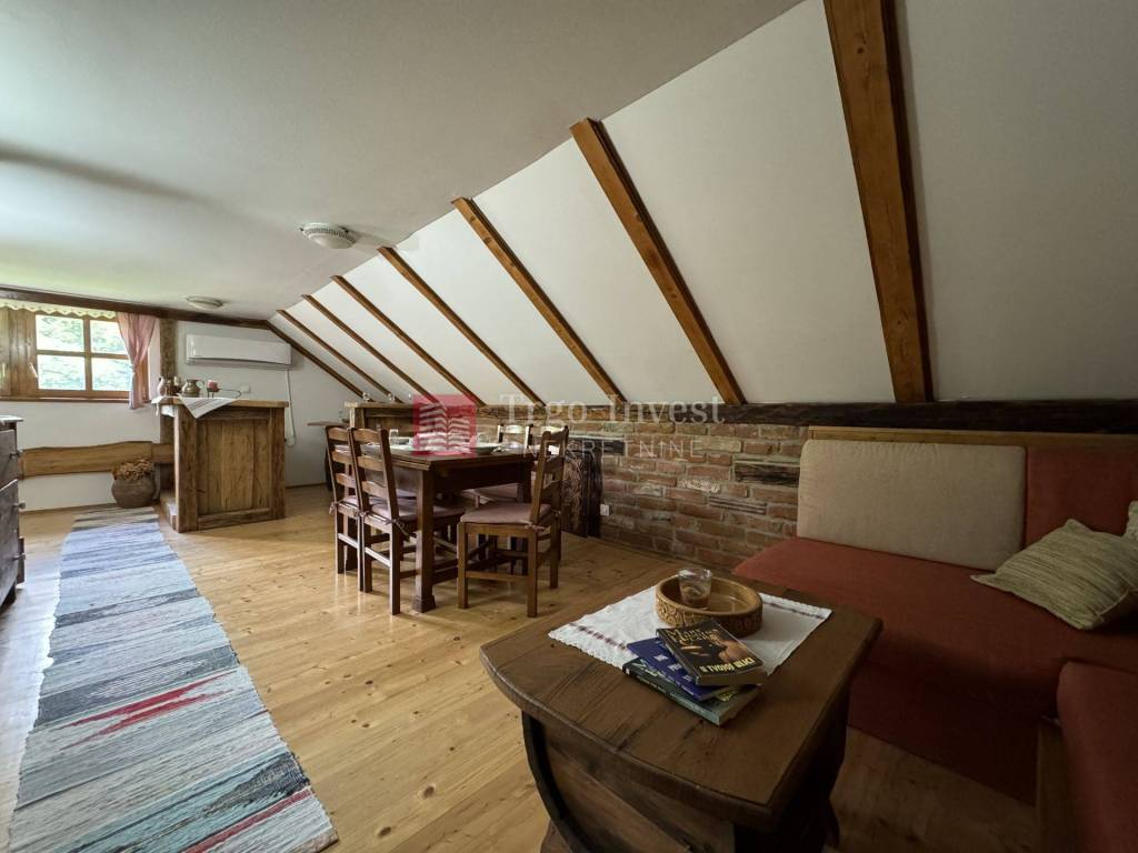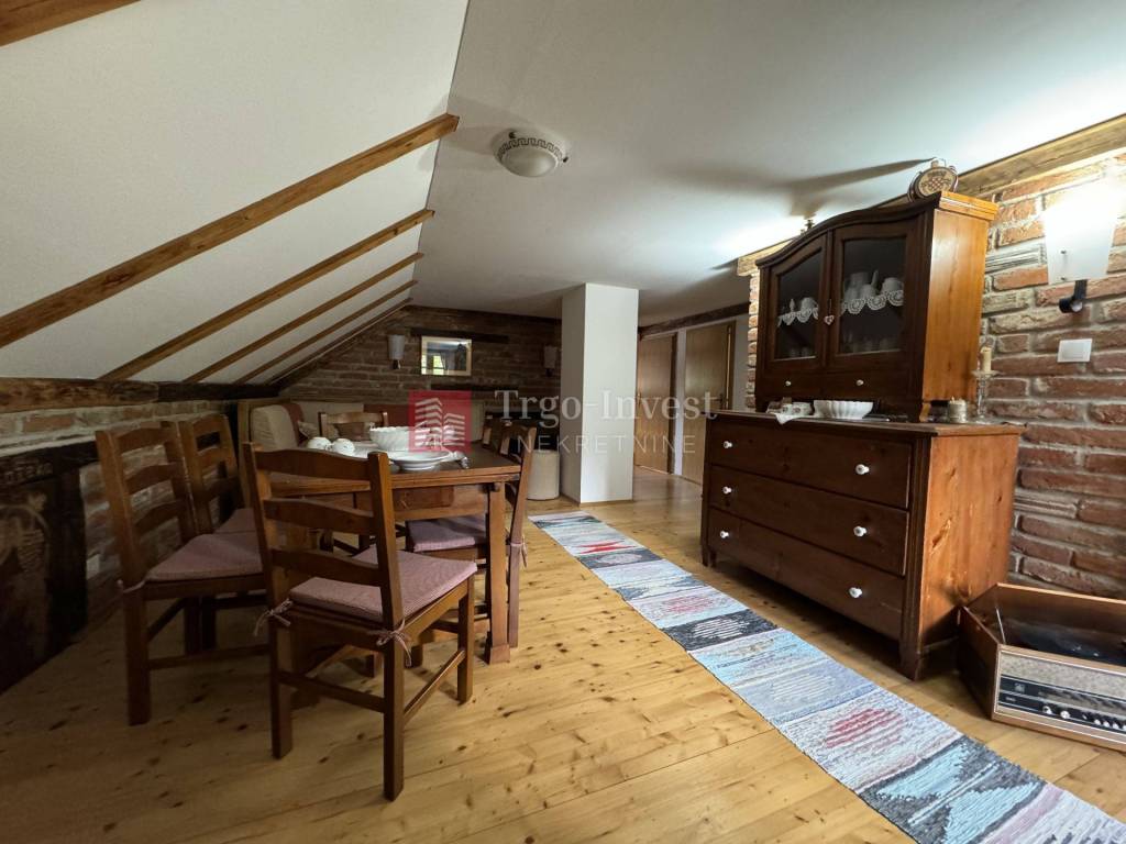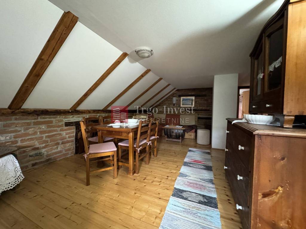 Kat (cca 80 m²) – dnevni prostor sa šankom, blagovaonica, dnevna soba, tri spavaće sobe, kupaonica, dvije klime i peć na drva.