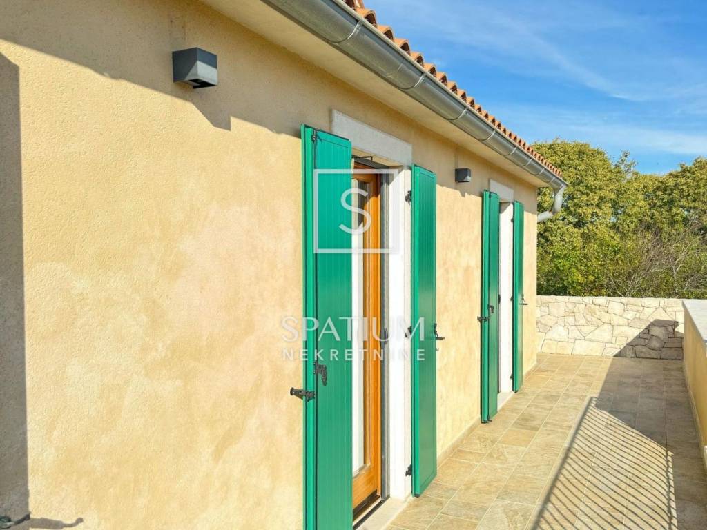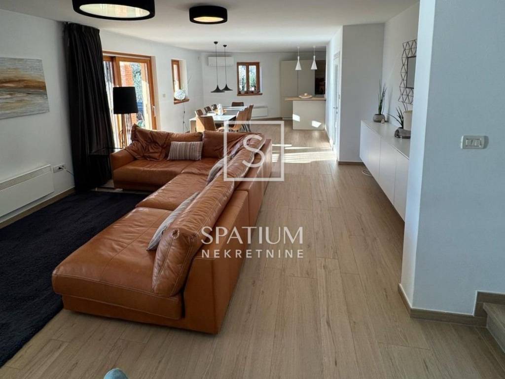 LABIN, u ponudi imamo obiteljsku kuću koja se prostire na tri etaže: podrum, prizemlje i kat. Podrum uključuje hodnik i dva spremišta, dok prizemlje obuhvaća ulazni hodnik sa stubištem, WC, prostrani dnevni boravak s kuhinjom i blagovaonicom, te dvije terase. Na katu se nalaze hodnik, dvije kupaonice, tri sobe i terasa. Kuća ukupne neto površine 172,62 m² opremljena je bazenom neto površine 44,00 m². Kvalitetna gradnja uključuje vanjske i unutarnje zidove od Poroterm opeke, polumontažnu međukatnu konstrukciju, krovnu konstrukciju od drvenih greda i kvalitetnu stolariju od ariša. Grijanje je izvedeno električnim radijatorima i kaminom s ventilatorima, a kuća je klimatizirana. Podovi su od hrastovog parketa u sobama, dok su ostale prostorije obložene keramičkim pločicama. Instalacije uključuju priključke za telefon i struju, septičku jamu i cisternu za vodu od cca 70 m³.