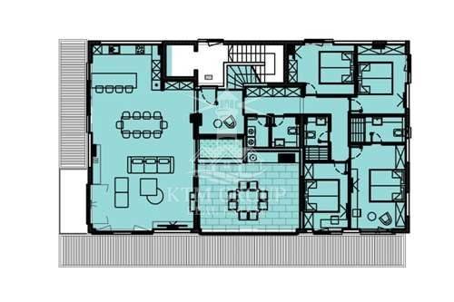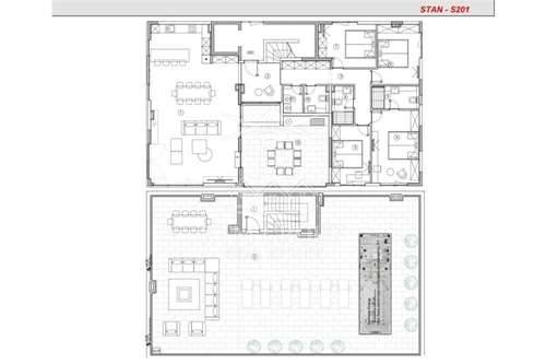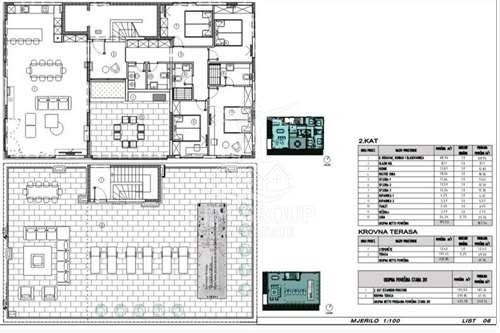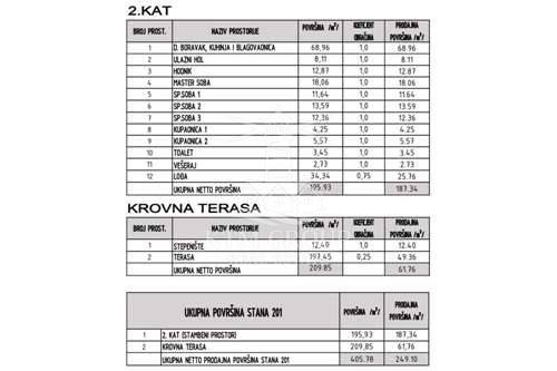 Sastoji se od: ulazni hol 8.11m2, hodnika 12.87m2, spavaće sobe1 11.64m2, master soba 18.06m2, dnevnog boravka s kuhinjom i blagovaonicom 68.96m2, spavaće sobe2 13.59m2, spavaće sobe3 12.36m2, kupaonice1 4.25m2, kupaonica2 5.57m2, toalet 3.45 m2, vešeraj 2.73m2, lođa 34.34m2, stepeništa 12.40m2 te krovne terase 197.45m2.