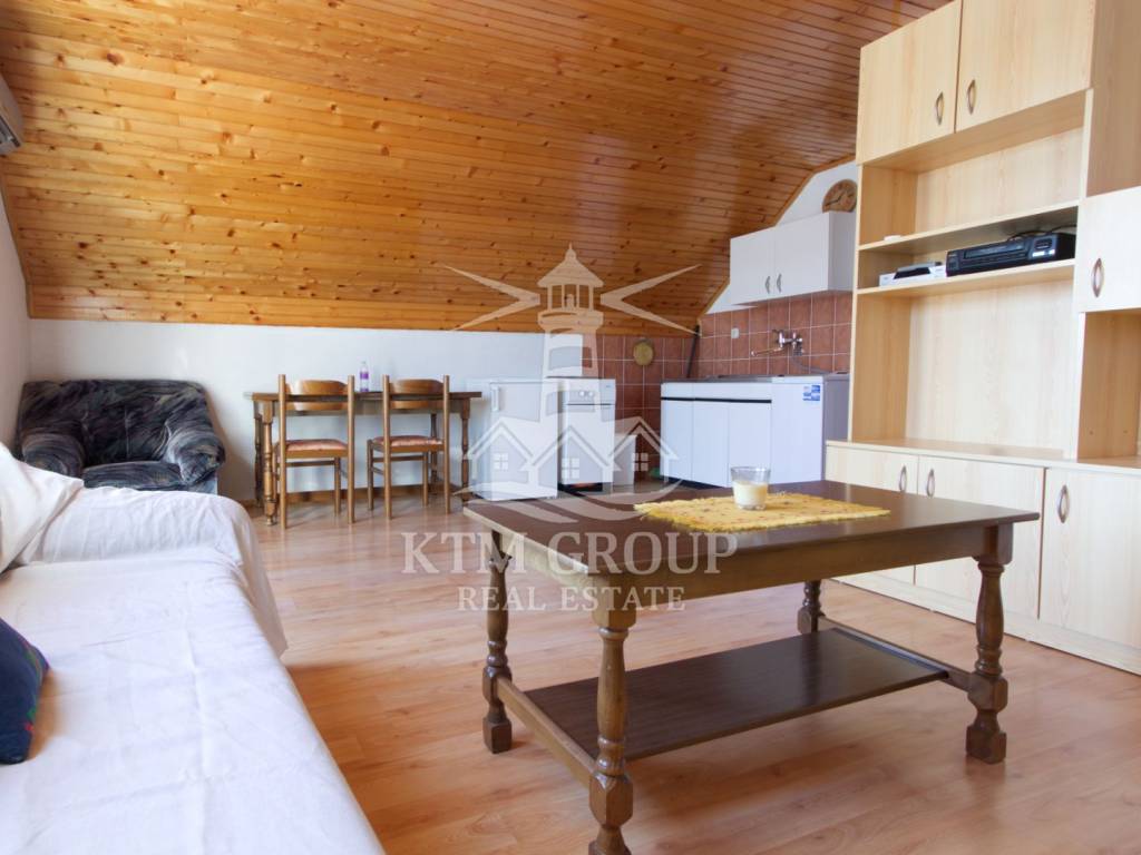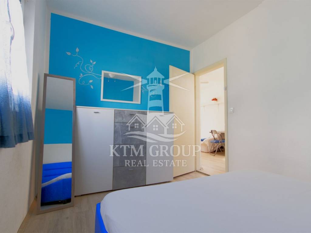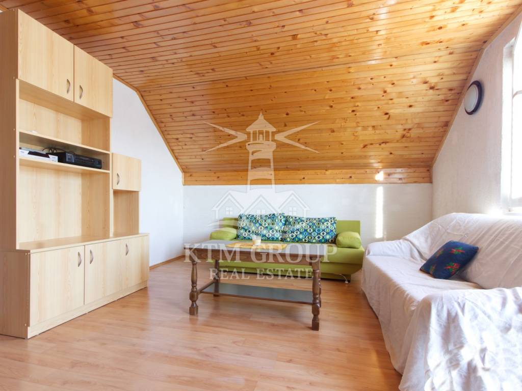 Na katu se nalazi jednosobni apartman od 42 m², s kuhinjom i dnevnim boravkom u kojem je smješten dodatni ležaj, spavaćom sobom i kupaonicom. Iz dnevnog boravka izlazi se na prostranu terasu s prekrasnim pogledom na more – savršeno mjesto za odmor i opuštanje.