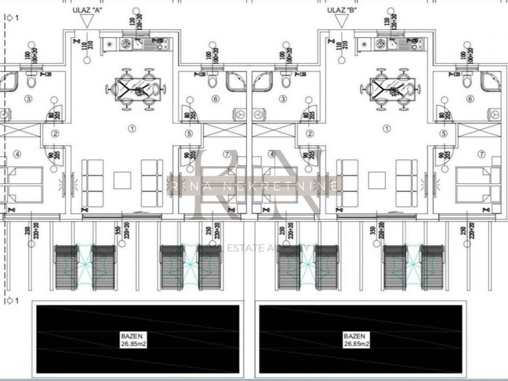 • Raspored prostorija svake kuće: 2 spavaće sobe, 2 kupaonice, open space kuhinja s dnevnim boravkom od 35 m²