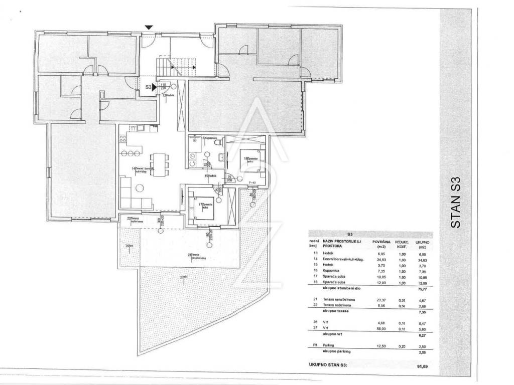 Stan S3 prostire se na ukupno 91,89 m², od čega je neto stambena kvadratura stana 75,77 m2, natkrivena terasa 5,35 m2 i nenatkrivena terasa 23,37 m², koja je savršeno mjesto za opuštanje i uživanje u mediteranskoj atmosferi. Na terasu se nastavlja vrt od 62,68 m2, idealan za mirise limuna, smokve i masline. Stan je u naravi trosobni stan koji se sastoji od hodnika, kupaonice, dvije spavaće sobe, open space dnevnog boravka, blagovaonice i kuhinje. Opremljen je podnim grijanjem u kupaonici, što pruža dodatnu udobnost zimi, a klima uređaji u svim prostorijama osiguravaju ugodan boravak tijekom cijele godine.