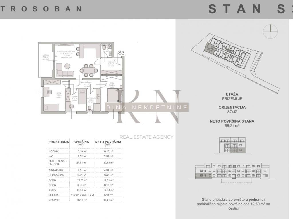 Stan se nalazi na prizemlju, netto površine 80.27m2 + loggia (brutto 7.92m2), ukupno obračunato 86.21m2 netto.