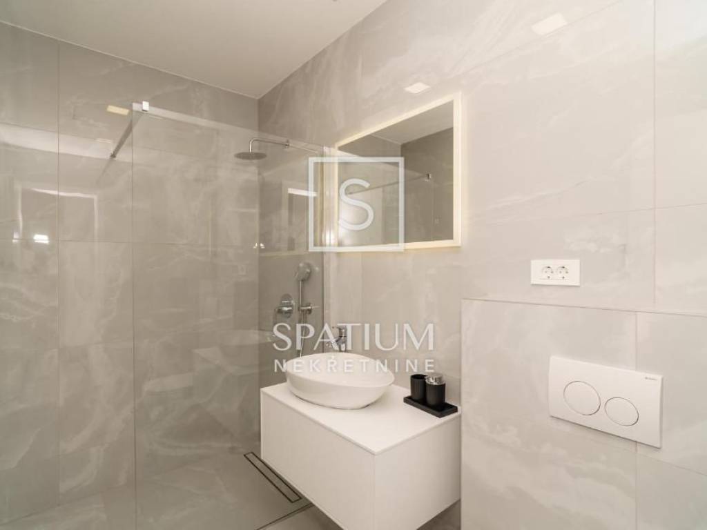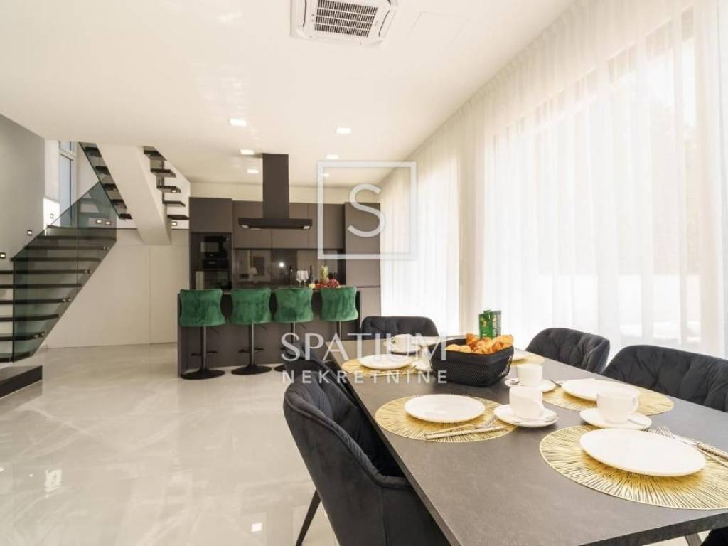 Unutar prostrane okućnice nalaze se dvorišna terasa, prostor za dodatne sadržaje, bazen sa sunčalištem, parkirni prostor za četiri vozila, stanica za električno punjenje automobila. Mirno okruženje, a opet blizina svih potrebnih sadržaja, visokokvalitetna gradnja, moderna i funkcionalna nekretnina je odličan odabir za cjelogodišnji život, oaza za odmor ili investicija u turističku djelatnost.
