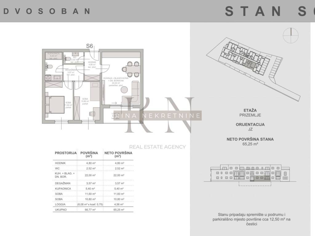 Stan se nalazi na prizemlju, netto površine 60.69m2 + loggia (brutto 6.08m2), ukupno obračunato 65.25m2 netto.