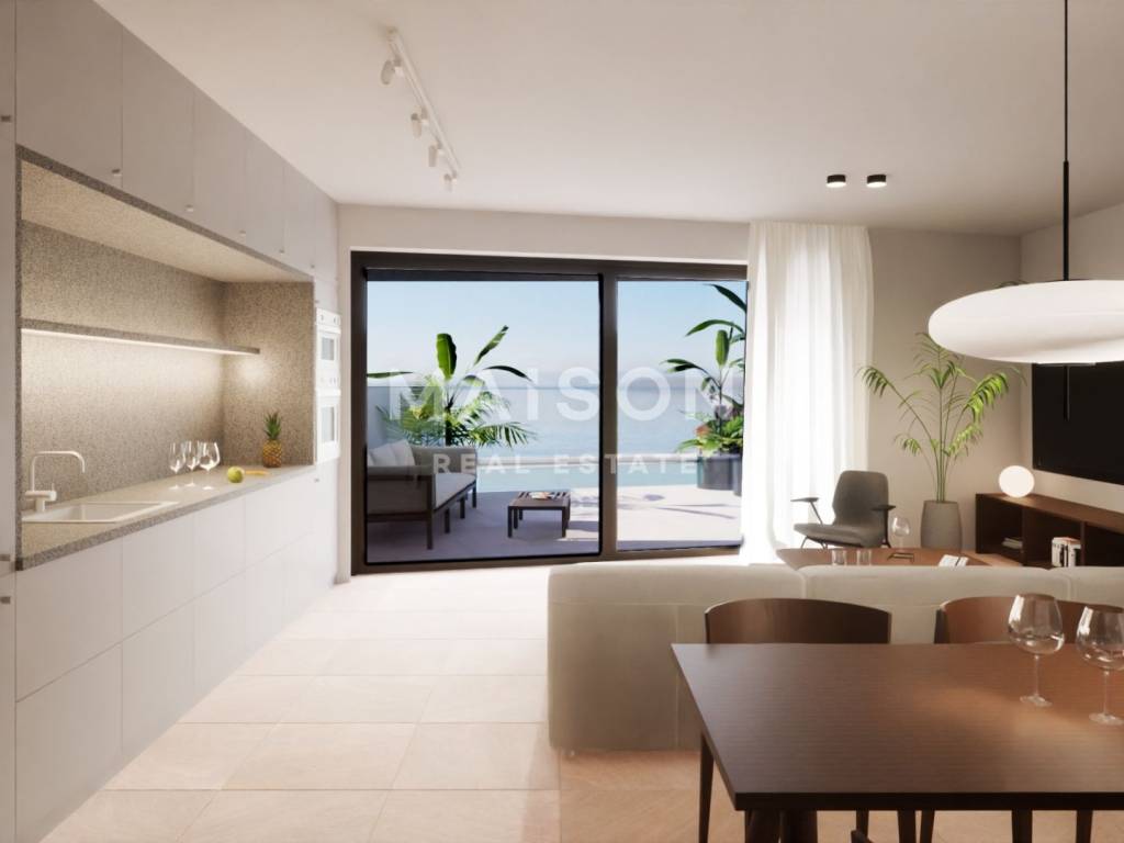 Na prvoj etaži smješteni su kupaonica, moderna kuhinja, blagovaonica i dnevni boravak otvorenog tlocrta, s izravnim pristupom vrtu i bazenu. Prostor je dizajniran s naglaskom na funkcionalnost i povezanost unutarnjeg i vanjskog dijela.