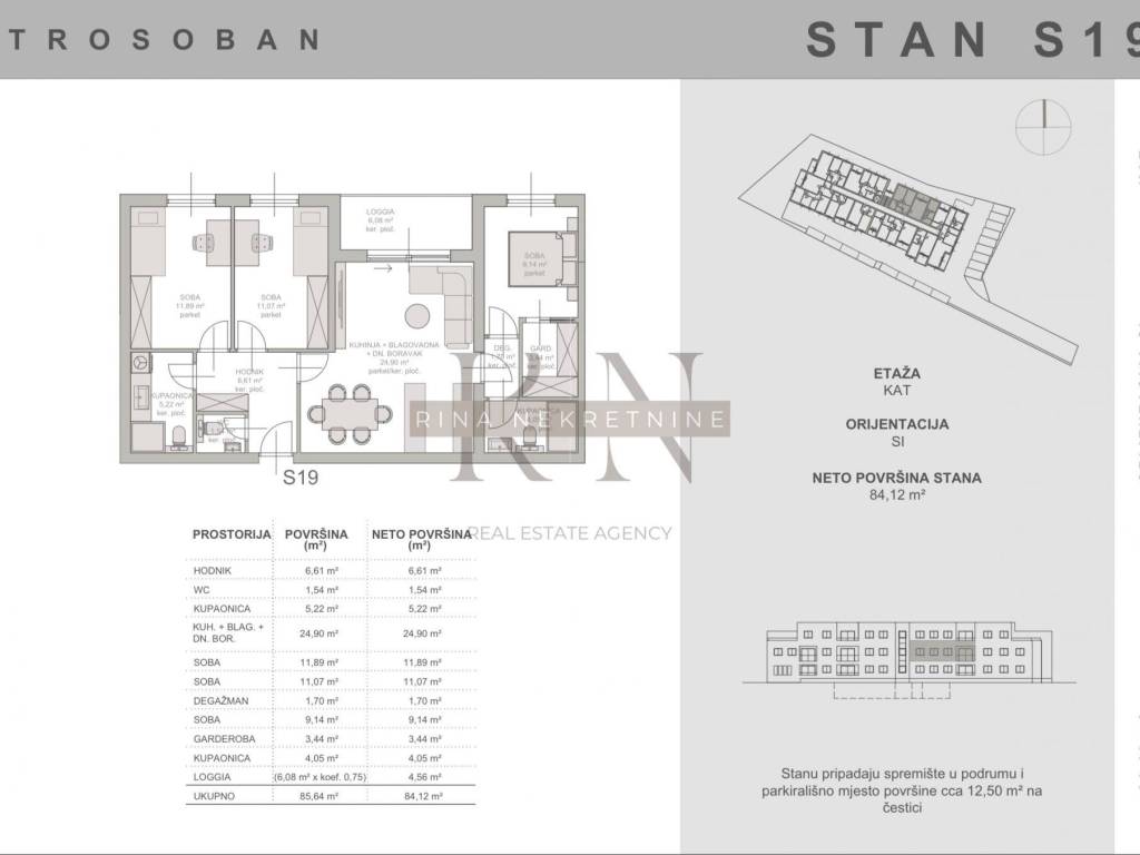 Tlocrt: ulazni hodnika sa prostorom za ormar i gostinjskim wcom, open space dnevni boravak s kuhinjom i blagovaonicom te izlazom na loggiu, 3 spavaće sobe od kojih je jedna en suite sa vlastitom garderobom i kupaonicom, te još jedne zasebne kupaonice za preostale dvije spavaće sobe.