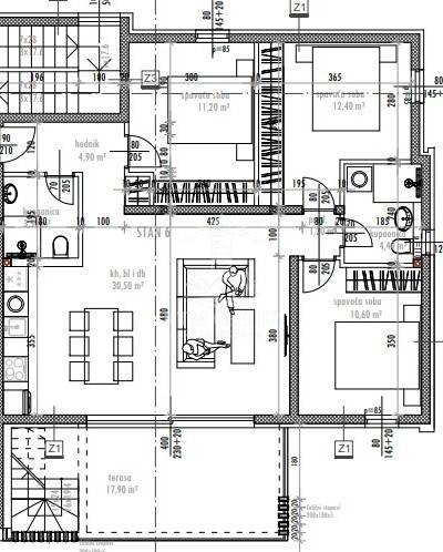 -kuhinja s blagovaonicom i dnevnim boravkom - površine 30,50 m2,