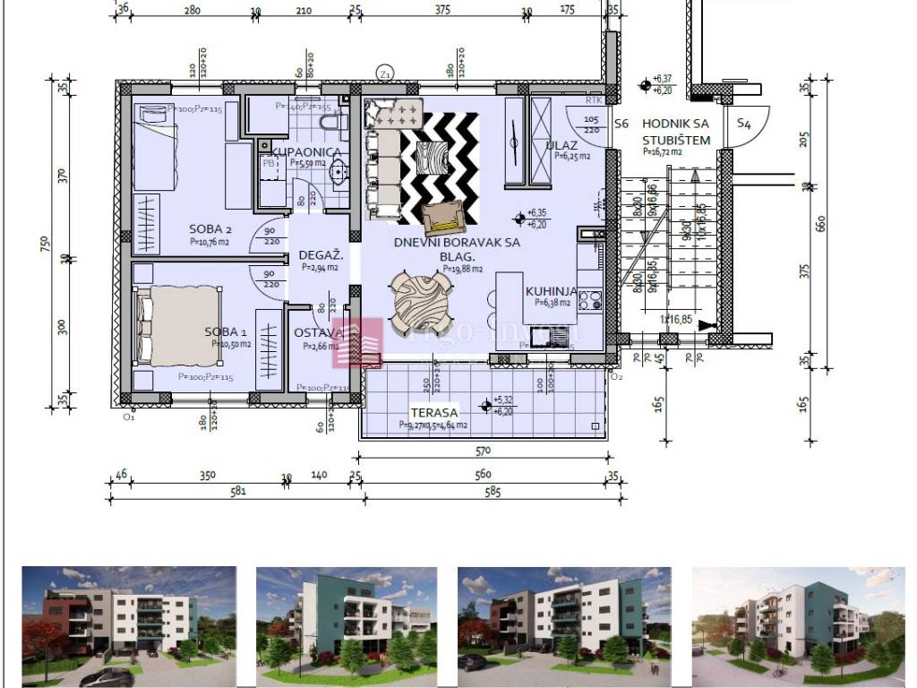 Stan S6 na II. katu koji se sastoji od ulaza, hodnika, dnevnog boravka sa blagovaonicom, kuhinje, ostave, 2 spavaće sobe, kupaonice i terase stambene površine 69,51 m2 + parking.