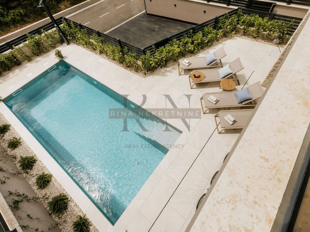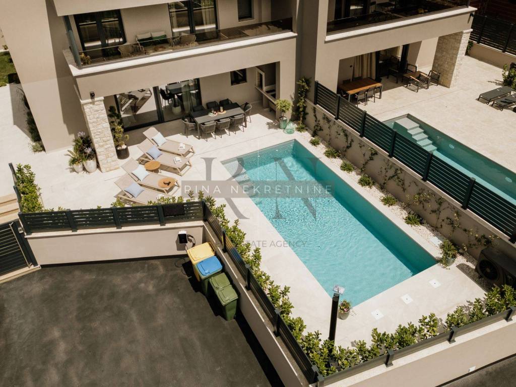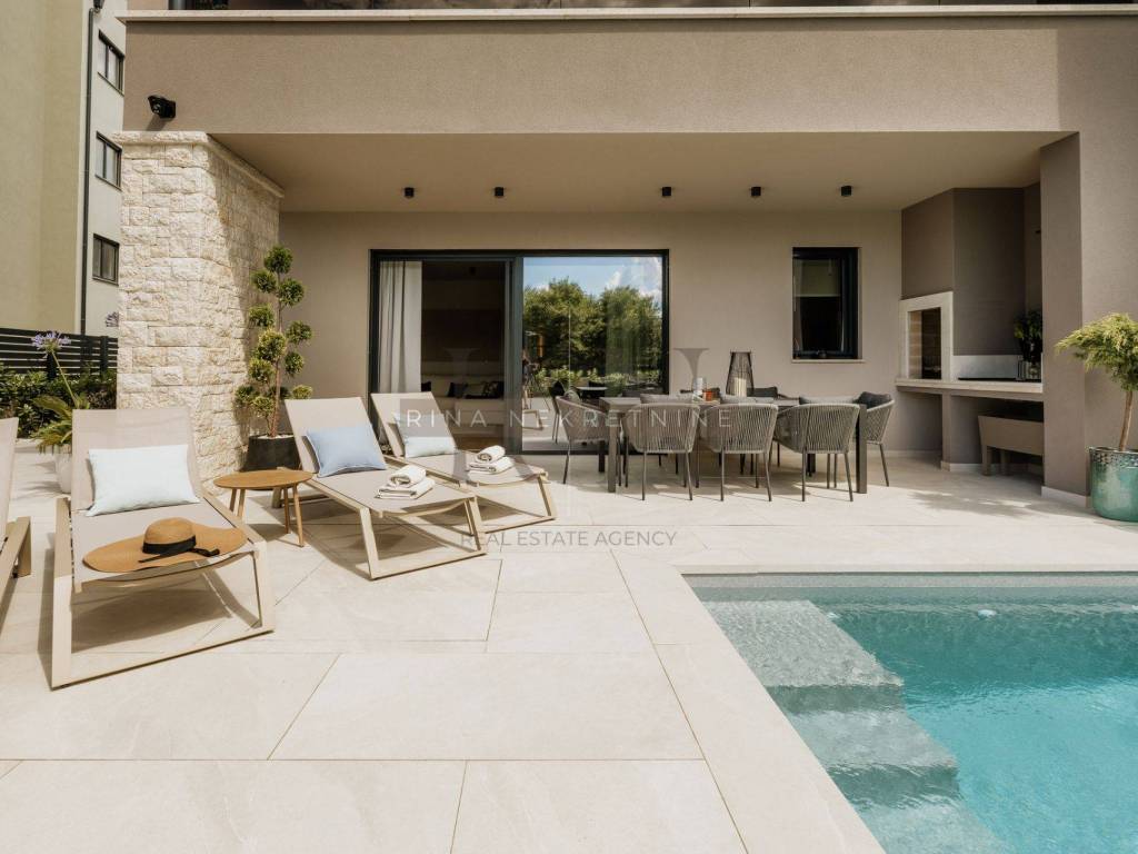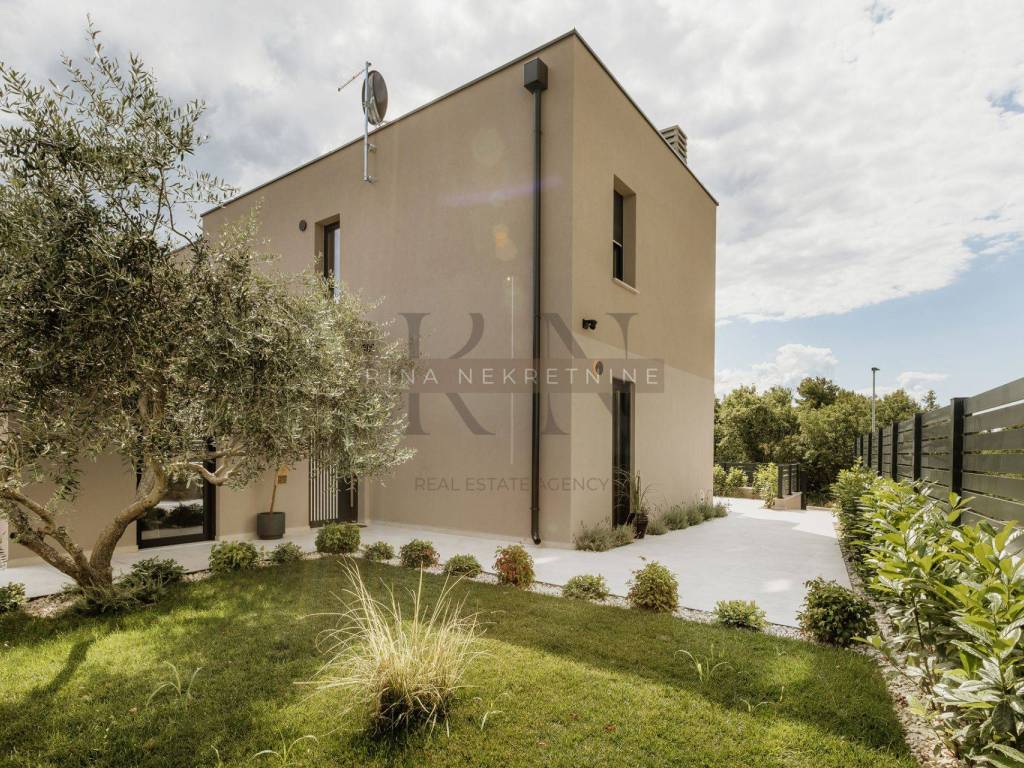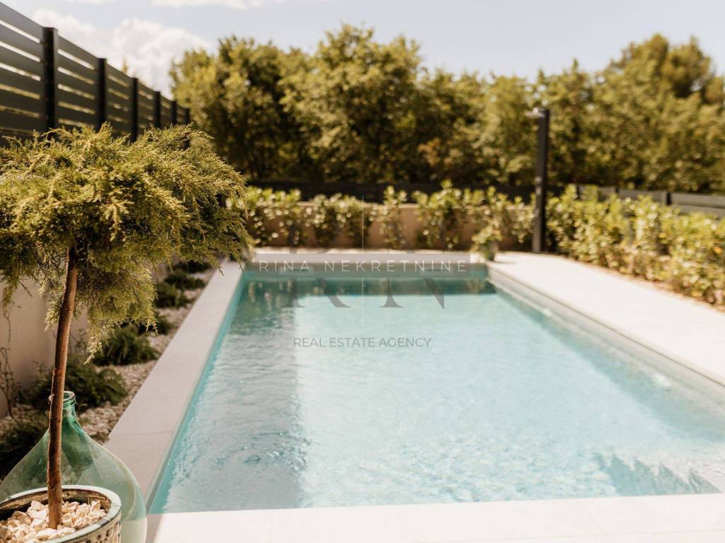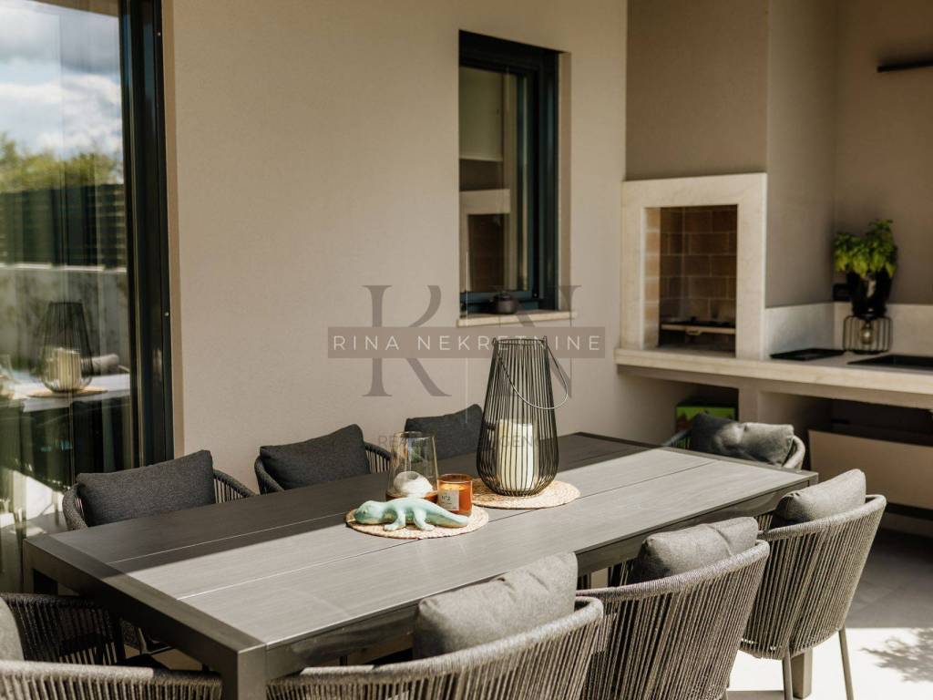 Karakteristike nekretnine: • Kvalitetna novogradnja s vrhunskim materijalima i opremom • Aluminijska stolarija (antracit), solomatic stijene, rolete • Podno grijanje putem dizalice topline, hlađenje putem klima u svakoj prostoriji • Grijani bazen obložen folijom, idealan za korištenje tijekom cijele godine • Krovna terasa (kompletno popločena i dovedene sve instalacije za uređenje) • Privatni parking s punjačem za električna vozila • Sunčalište i natkrivena terasa s ljetnom kuhinjom i zidanim roštiljem