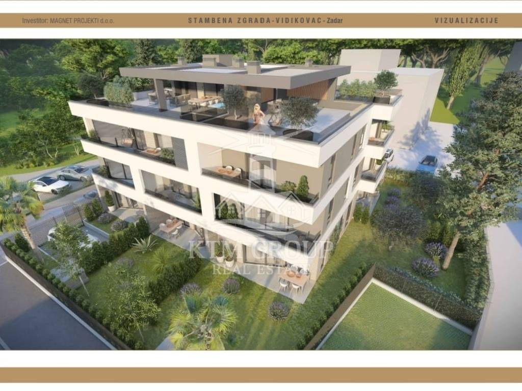Ova moderna stambena zgrada sadrži 11 stanova .Zgrada ima podzemnu garažu sa spremištima, prizemlje, prvi i drugi kat te krovne terase koje pripadaju stanovima na 2. katu. Zgrada je opremljena liftom!!