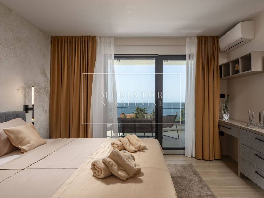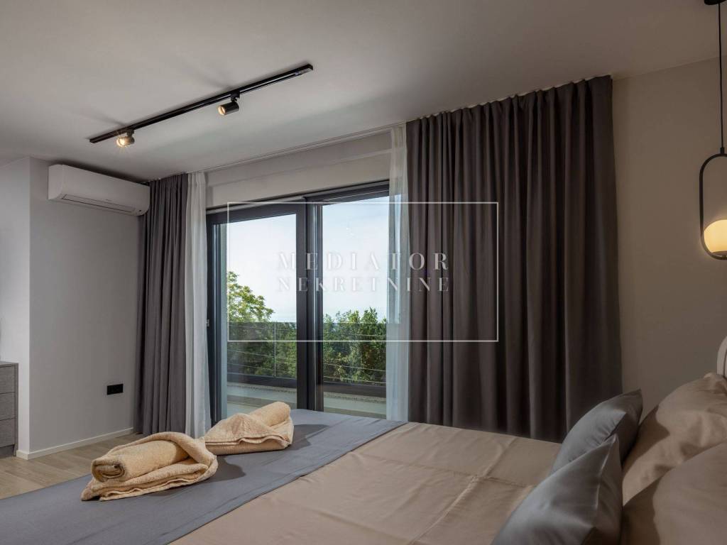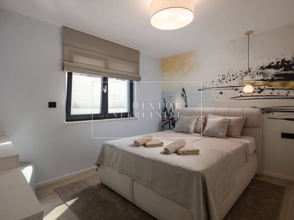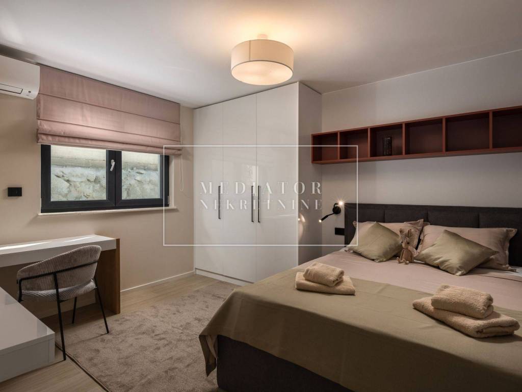Na gornjoj etaži nalaze se tri spavaće sobe, svaka pažljivo uređena i opremljena za maksimalnu udobnost. Master spavaća soba ima vlastitu garderobu i kupaonicu, dok dodatne sobe dijele treću, moderno uređenu kupaonicu. S kata se također izlazi na još jednu natkrivenu terasu s djelomičnim pogledom na more.