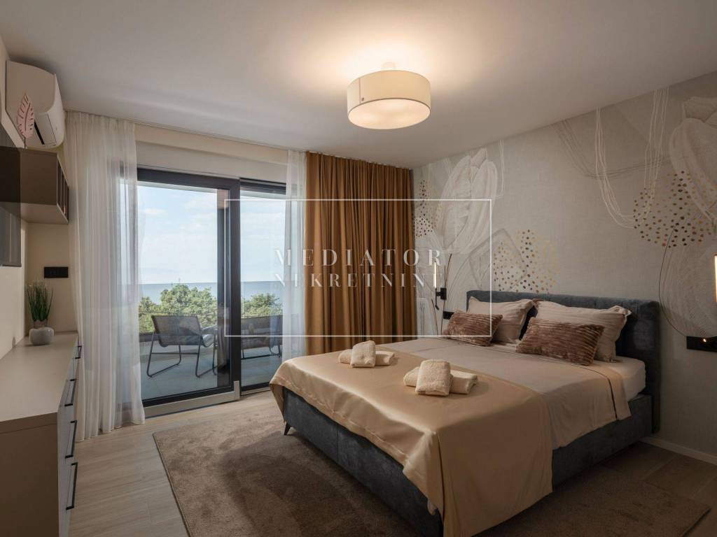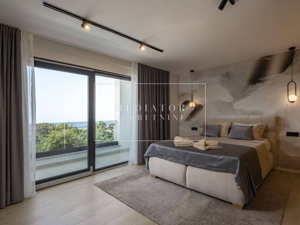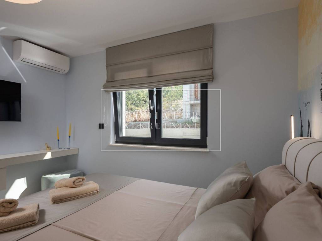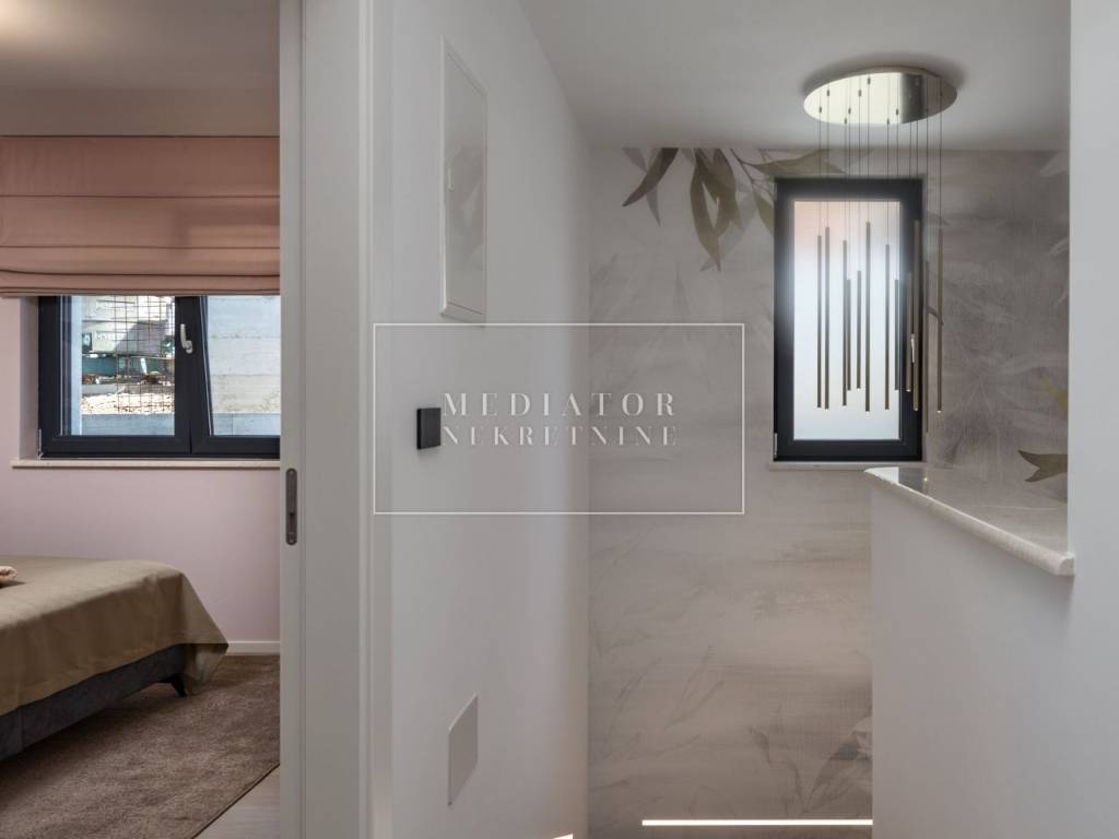 Na gornjoj etaži nalaze se tri spavaće sobe, svaka pažljivo uređena i opremljena za maksimalnu udobnost. Master spavaća soba ima vlastitu garderobu i kupaonicu, dok dodatne sobe dijele treću, moderno uređenu kupaonicu. S kata se također izlazi na još jednu natkrivenu terasu s djelomičnim pogledom na more.