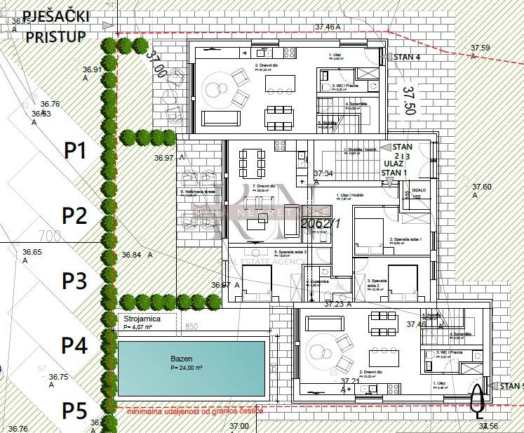 Projekt obuhvaća tri stana (75 m², 85 m² i 93,42 m²) te dvije kuće, od kojih jedna ima vlastiti bazen.