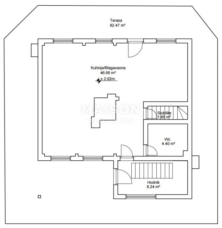 Prizemlje je osmišljeno kao prostrani dnevni prostor otvorenog koncepta, gdje se nalaze dnevni boravak, kuhinja, blagovaonica i kupaonica. Centralni dio dnevnog boravka zauzima veliki kamin na drva, stvarajući toplinu i ugodnu atmosferu. Iz ovog prostora izlazi se na prostranu terasu, s koje se pruža očaravajući pogled na zelenilo i netaknutu prirodu.