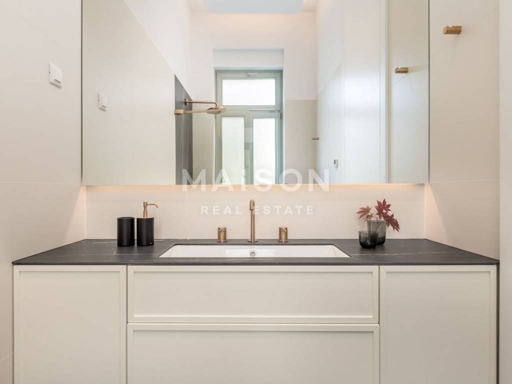 Stan se nalazi na 1. katu i obuhvaća hodnik, dvije kupaonice, dnevni boravak s kuhinjom i blagovaonicom, jednu spavaću sobu i balkon, ukupne površine 73,05 m². U kupaonicama je postavljeno električno podno grijanje, dok je u ostalim prostorijama instaliran fan-coil sustav grijanja i hlađenja koji omogućuje individualnu regulaciju temperature. Podovi su obloženi troslojnim hrastovim parketom, čime se dodatno naglašava toplina i elegancija prostora, dok drvena stolarija vjerno prati povijesni karakter zgrade te osigurava odličnu toplinsku i zvučnu izolaciju.