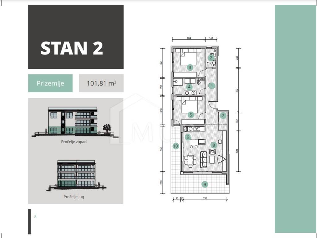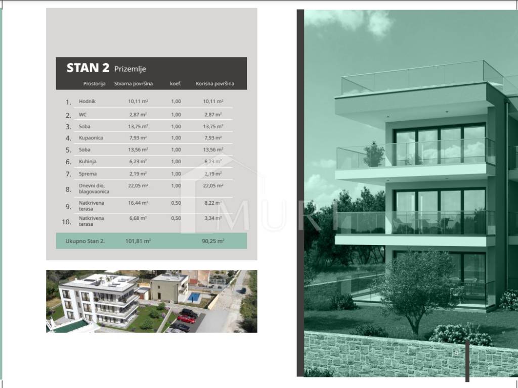 Okolica zgrade je uredna i uređena, a sam stan se sastoji od hodnika, wc-a, kupaonice, dvije spavaće sobe, kuhinje, spreme, dnevnog boravka i blagovaonice. Terasa je L oblika, te se proteže na zapad i jug, pružajući obilje prirodnog svjetla i prekrasne poglede tijekom cijelog dana.