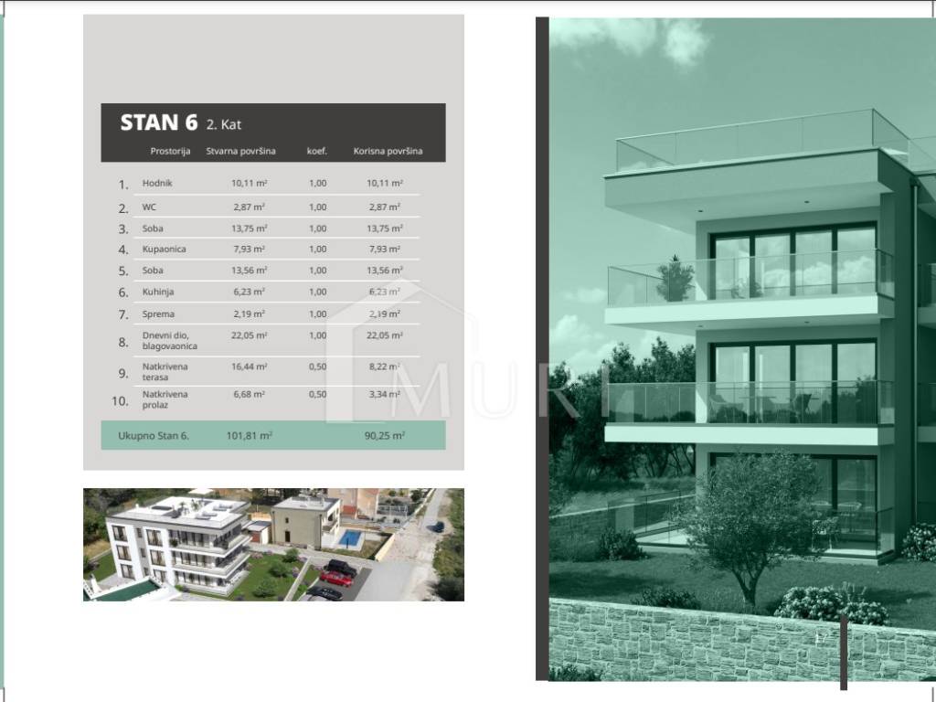 Okolica zgrade je uredna i uređena, a sam stan se sastoji od hodnika, wc-a, kupaonice, dvije spavaće sobe, kuhinje, spreme, dnevnog boravka i blagovaonice. Terasa je L oblika, te se proteže na zapad i jug, pružajući obilje prirodnog svjetla i prekrasne poglede tijekom cijelog dana.