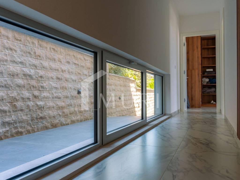 Prvi kat, dostupan putem gornjeg ulaza, sadrži dugački hodnik koji vodi do glavne spavaće sobe s kupaonicom, walk-in ormarom i privatnom terasom s jacuzzijem.