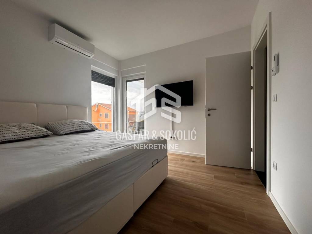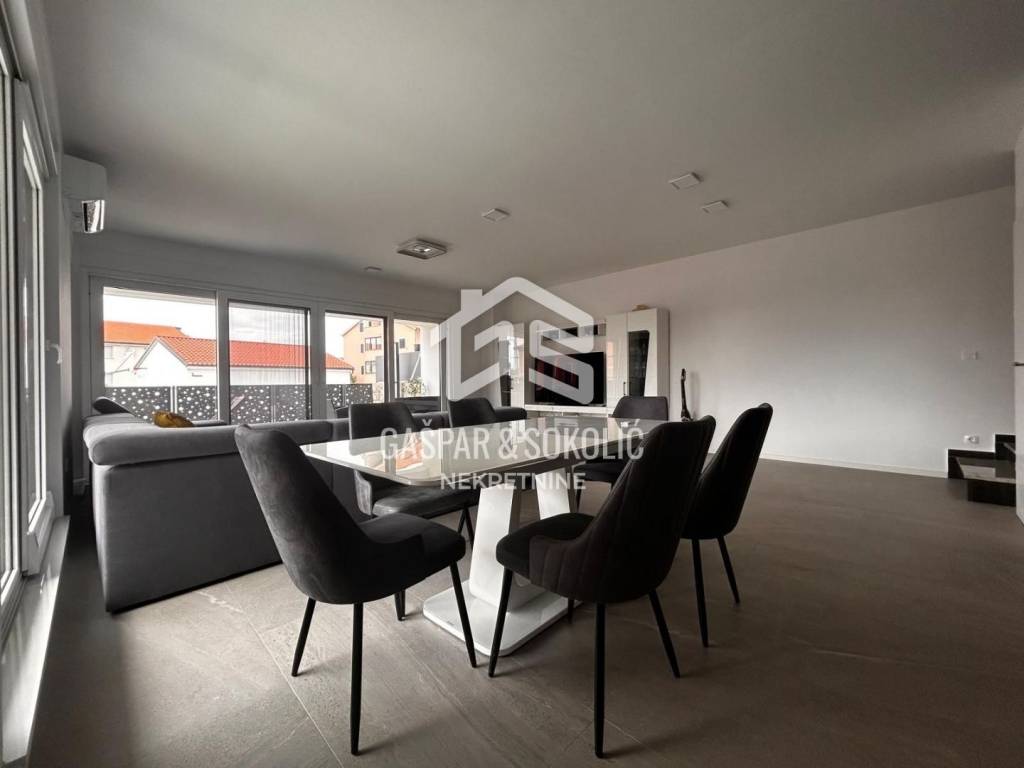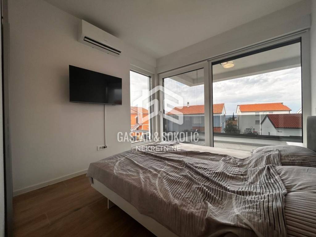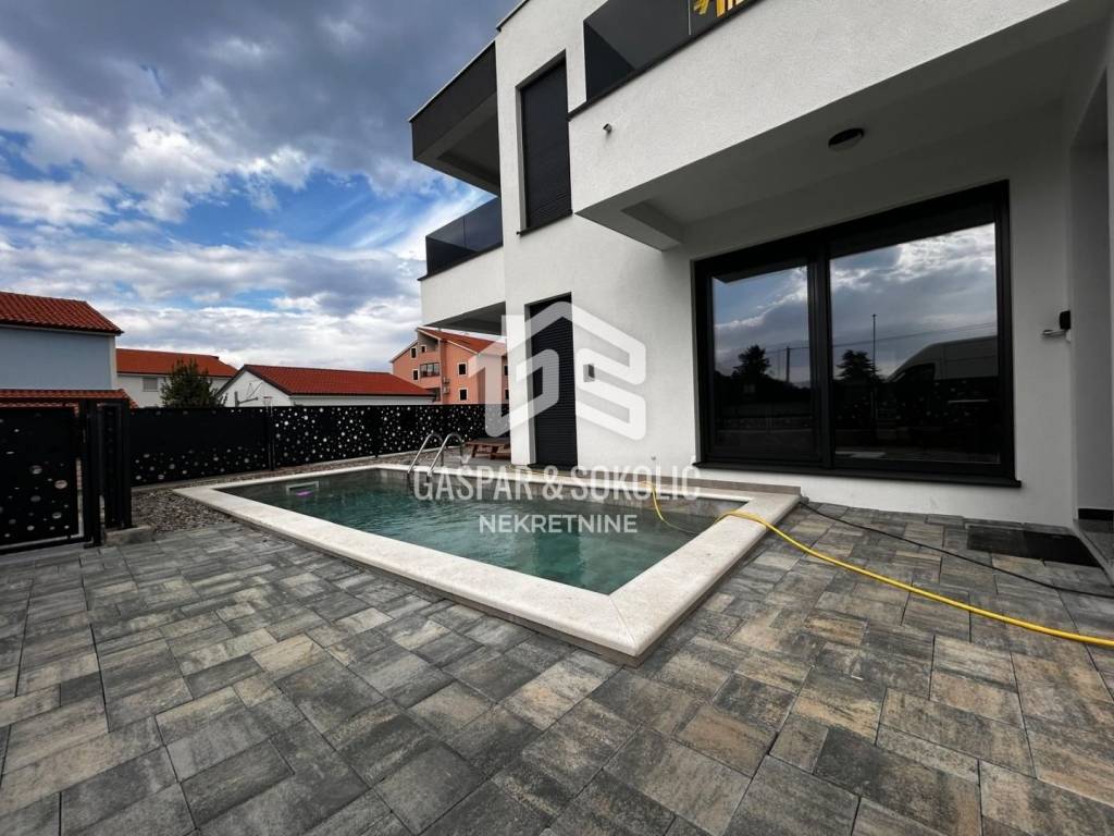 Donja etaža kuće očarava prostranim i svijetlim dnevnim boravkom koji se skladno stapa s modernom kuhinjom i elegantnom blagovaonicom, stvarajući savršen prostor za opuštanje i druženje. Iz ovog predivnog prostora izlazi se na prostranu terasu, koja poziva na uživanje u suncu i svježem zraku. Na gornjoj etaži smještene su spavaće sobe, svaka s izlazom na balkon, gdje se može uživati u miru i pogledu na okolnu prirodu.