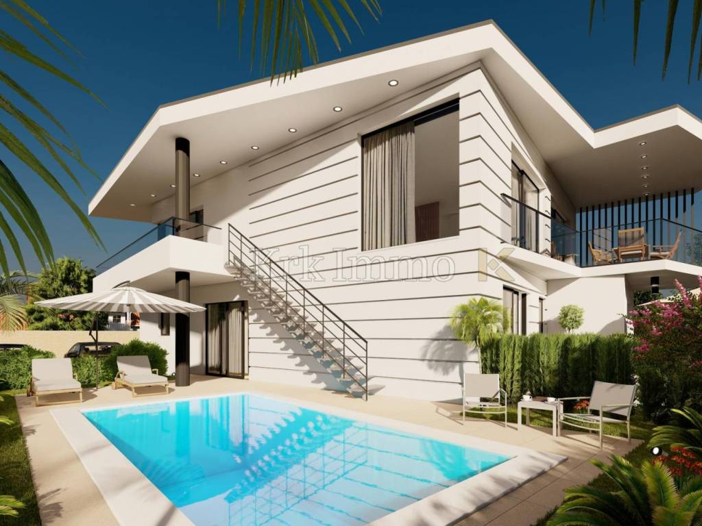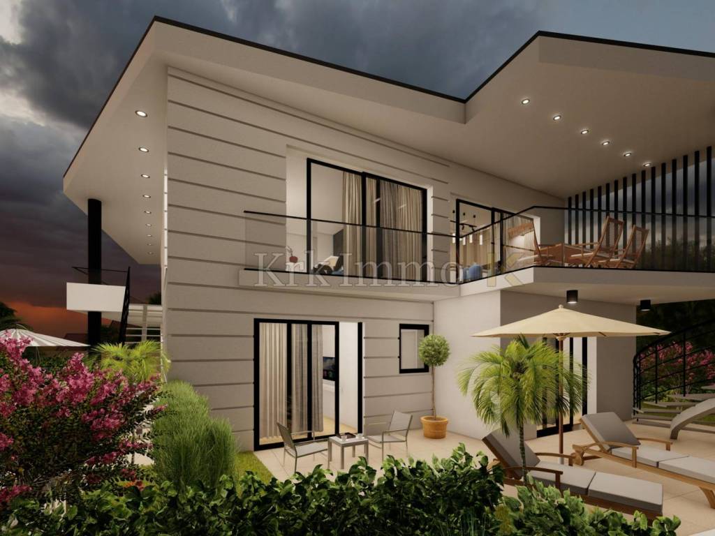 Na prodaju je dvojna moderna kuća, visoke kvalitete gradnje i opreme na prestižnoj lokaciji udaljenoj od mora i plaža samo nekoliko minuta hoda. Kuća ima stambenu površinu 197 m2, a prostorije su optimalnog rasporeda, tako se u suterenu nalazi master spavaća soba s privatnom kupaonicom, WC, ostava te prostorija koja može biti teretana, wellness, igraonica ili slično.