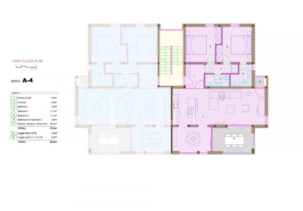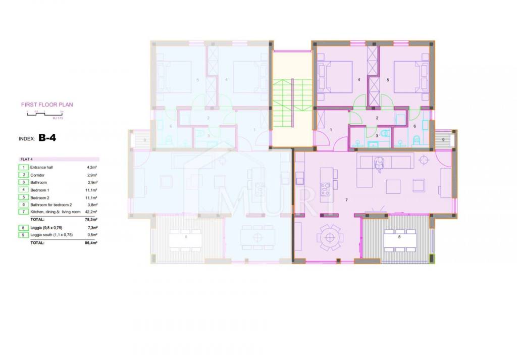 Prostrani dnevni boravak otvorenog koncepta povezuje kuhinju, blagovaonicu i dnevni dio, s izlazom na lođu – savršeno mjesto za opuštanje na svježem zraku. Tri udobne spavaće sobe, od kojih dvije imaju vlastitu kupaonicu Elegantna glavna kupaonica (s kvalitetnim završnim obradama. Ulazni hodnik i unutarnji hodnik za funkcionalan raspored prostora. Dvije lođe nude dodatni prostor za uživanje na otvorenom. Udobnost i suvremeni standardi