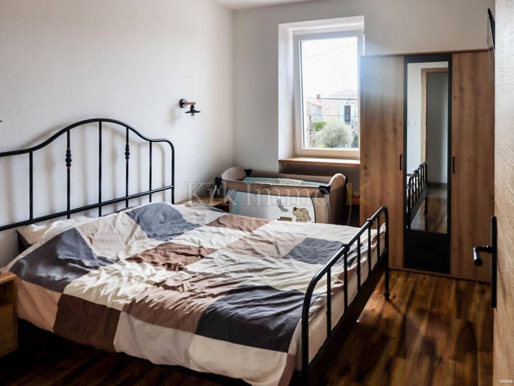 Prizemlje kuće sadrži WC, konobu te prostrani prostor koji objedinjuje dnevni boravak, blagovaonicu i kuhinju. Unutarnje stepenice vode na kat gdje se nalaze tri spavaće sobe i tri kupaonice. Kuća je obnovljena s pažnjom i izrađena od kvalitetnih materijala.