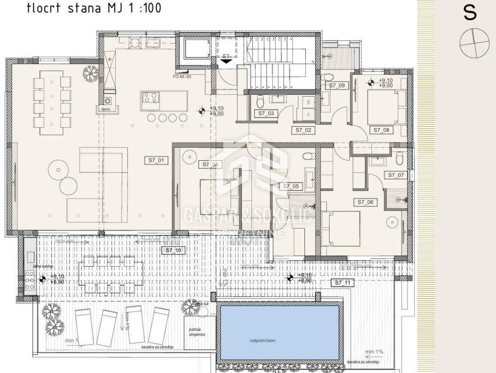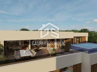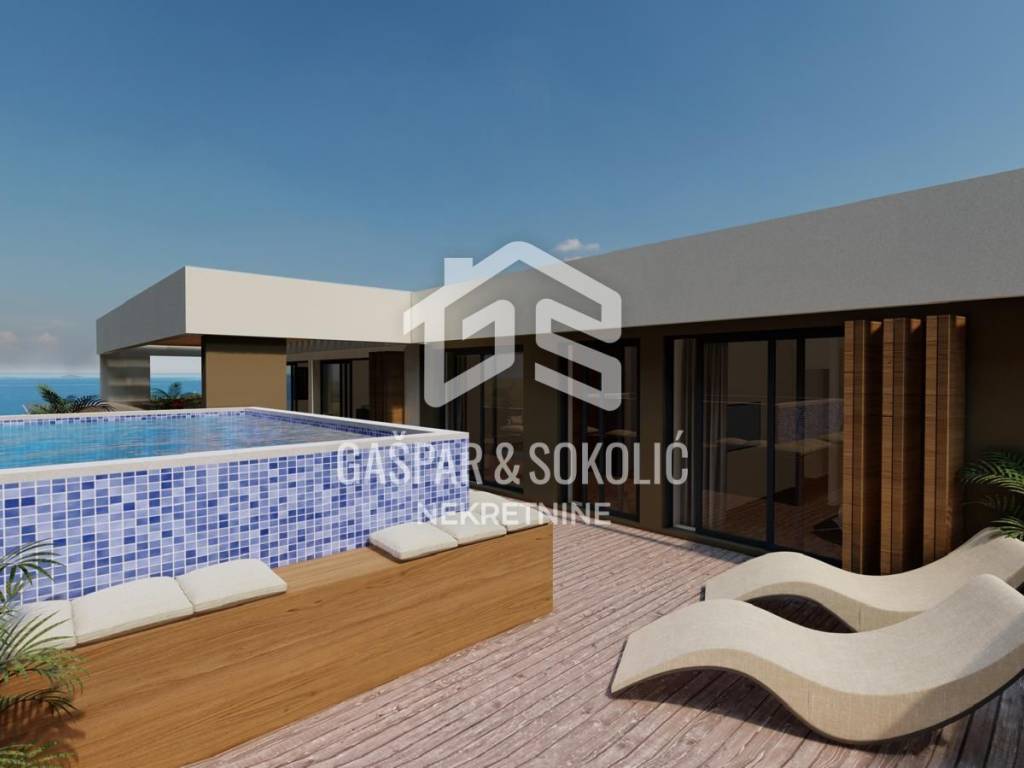 Iz dnevnog boravka izlazi se na lođu koja nudi dodatni vanjski prostor, savršen za uživanje u jutarnjoj kavi ili večernjim trenucima. Stan također ima veliku terasu koja je idealna za sunčanje, opuštanje ili uživanje u predivnom pogledu na okoliš i more. Na terasi se nalazi i privatni bazen, koji pruža luksuzno iskustvo opuštanja uz vlastiti bazen, što ovu nekretninu čini još atraktivnijom.