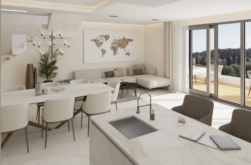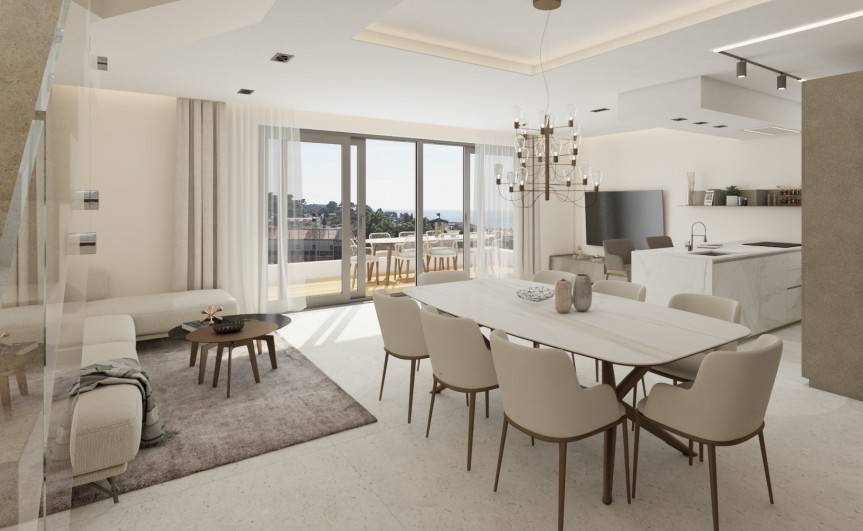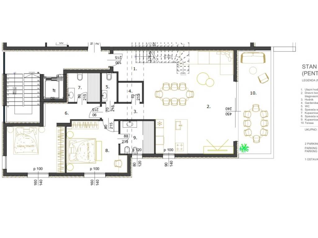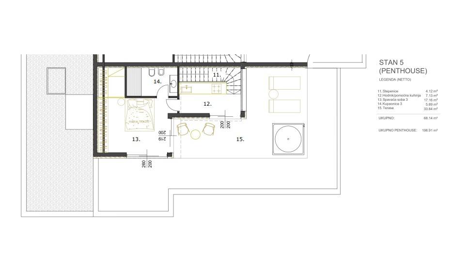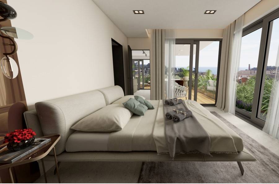 Stan se sastoji od prostranog i otvorenog dnevnog dijela sa kuhinjom, blagovaonom i boravkom od 48 m2 sa izlazom na terasu od 18,79 m2. Hodnikom su redom raspoređeni ostava, odvojeni sanitarni čvor, dvije spavaće sobe od kojih jedna ima kupaonicu te zasebna kupaonica. Stepenicama se ide u potkrovlje u kojem se nalaze spavaća soba sa kupaonicom, wellness prostorija sa saunom i jaccuzijem te terasa od 33,5 m2 sa koje se pruža prekrasan otvoren pogled na more i grad.