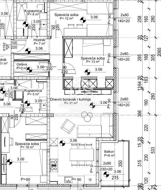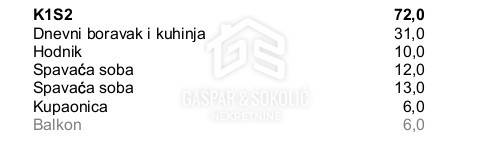 Stan se sastoji od prostranog dnevnog boravka povezanog s kuhinjom i blagovaonicom, dvije spavaće sobe, moderno uređene kupaonice i balkona od 6 m², idealnog za opuštanje i uživanje na otvorenom.