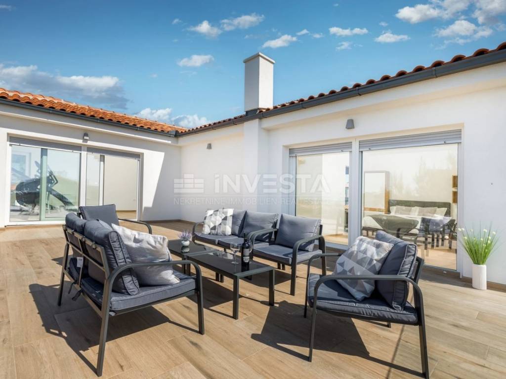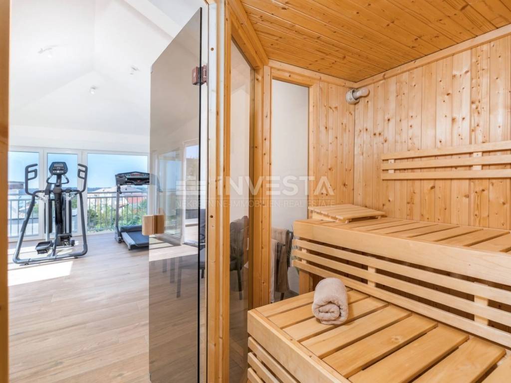 Soba s fitnessom, saunom i tušem, te izlazom na prostranu terasu od 40 m² s panoramskim pogledom na more i Brijunski arhipelag.