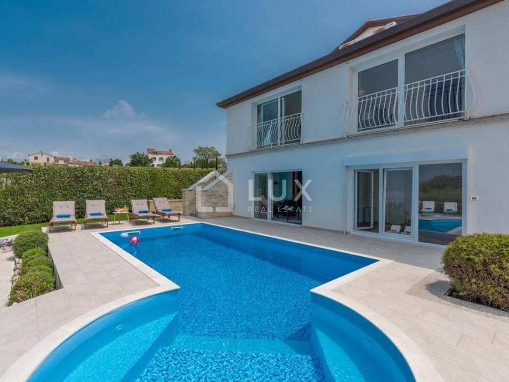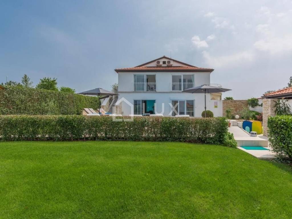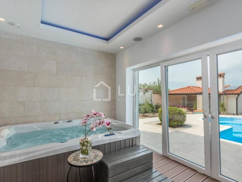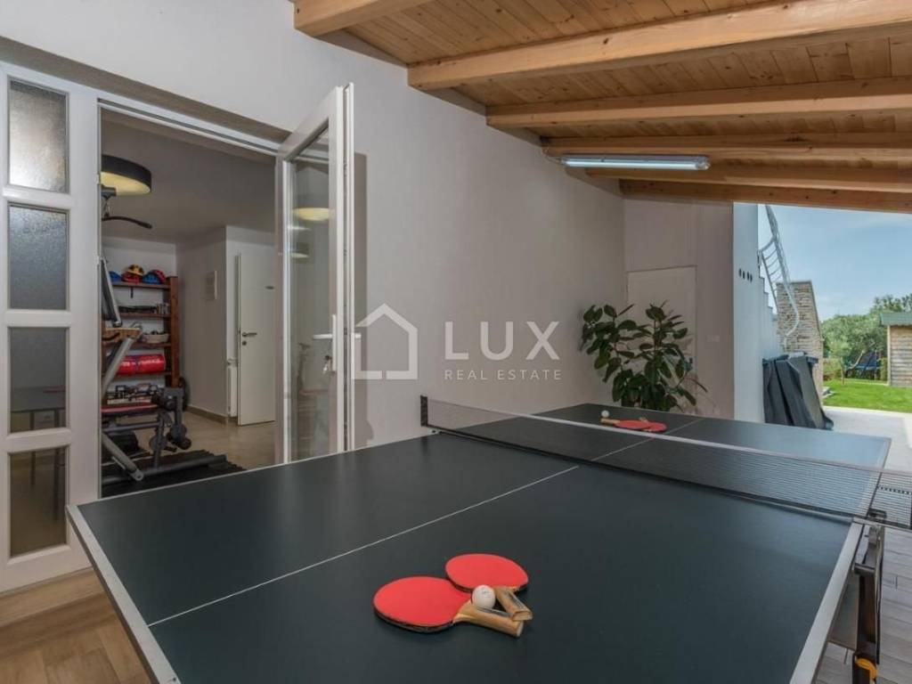 Iz dnevnog boravka moguće je stepenicama spustiti se direktno u ograđeni dio dvorišta u kojem se nalazi vanjski bazen s whirlpoolom, tuš i natkrivena ljetna kuhinja. Tu su još i vanjski kamin za roštilj, sunčalište sa ležaljkama i prostrana ograđena travnata površina.