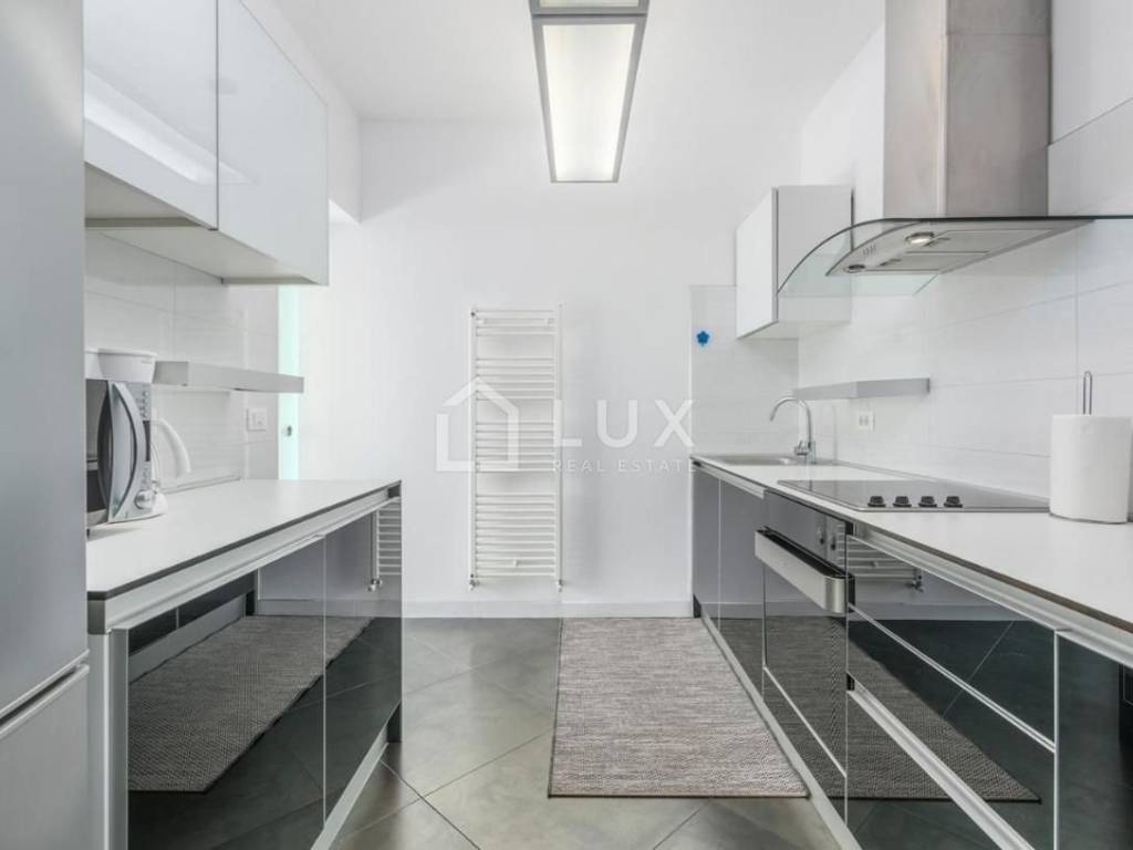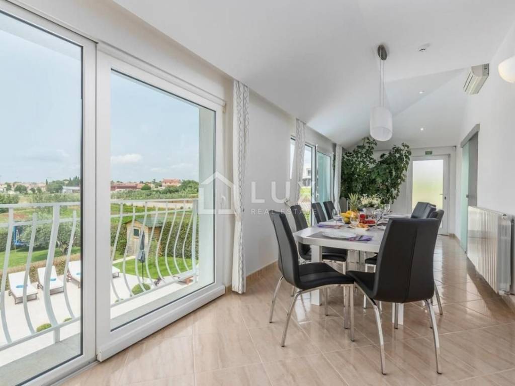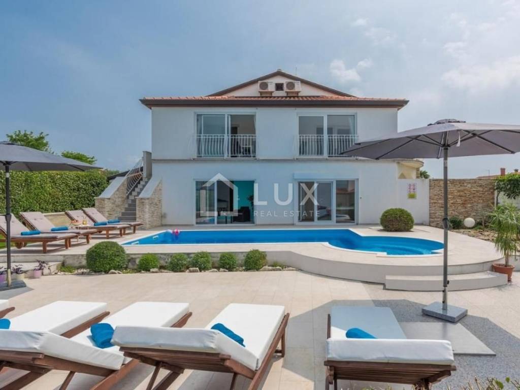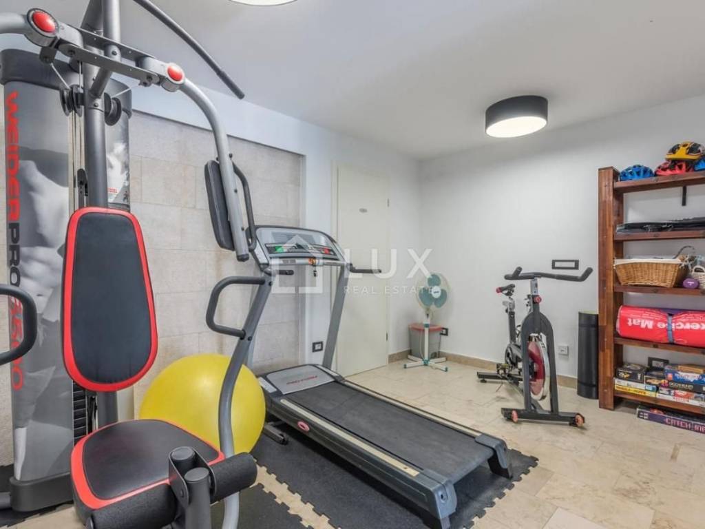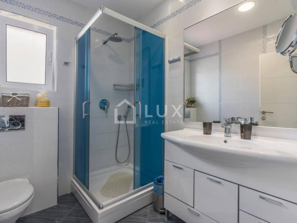Prizemlje se sastoji od kuhinje, blagovaone i dnevnog boravka, kupaone, dvije spavaće sobe, fitnessa i wellnessa u kojem se nalazi jacuzzi, sauna i prostorija za relax. Na prvom katu nalaze se tri spavaće sobe, dvije kupaonice i zaseban manji wc, veliki dnevni boravak, kuhinja i blagovaonica s koje se pruža prekrasan pogled na more i slikovit krajolik. Sve prostorije u kući su klimatizirane te moderno opremljene.