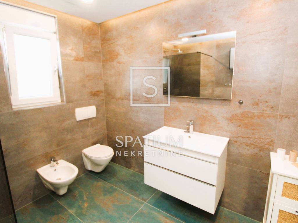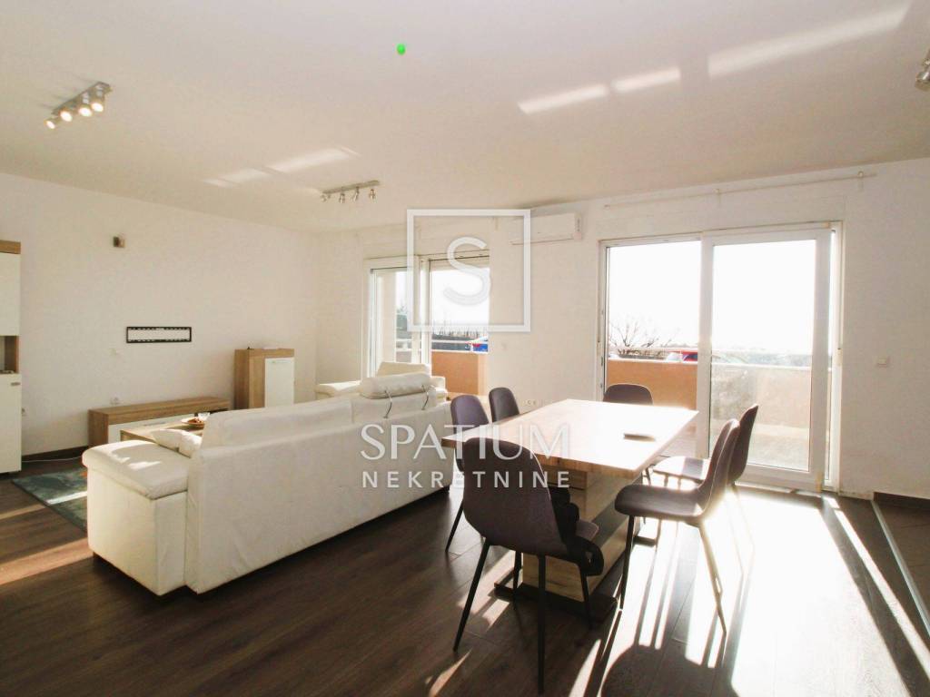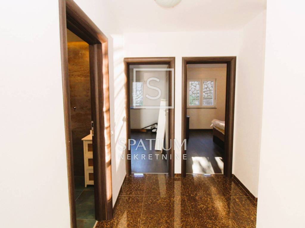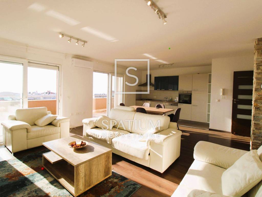SRDOČI, u ponudi imamo stan u novijoj zgradi. Stan se sastoji od dnevnog boravka s kuhinjom, tri sobe, kupaonice, hodnika, toaleta, predprostora i terase. Ukupna površina je 132,26 m2 kojoj pripadaju drvarnica, površine 4,67 m2 i prostorija za alat površine 9,12 m2 te u okućnici dva parkirna mjesta. Blizina svih sadržaja. Odlična prometna povezanost.