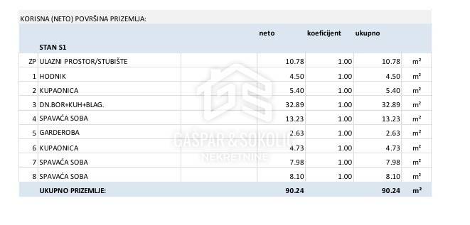 Stan se nalazi u prizemlju zgrade te ima neto površinu od 79,46 m², dok bruto površina iznosi 98,52 m². Prostorno je iznimno dobro osmišljen i sastoji se od ulaznog hodnika, dnevnog boravka s blagovaonicom i kuhinjom otvorenog koncepta, tri spavaće sobe, dvije kupaonice te garderobe.