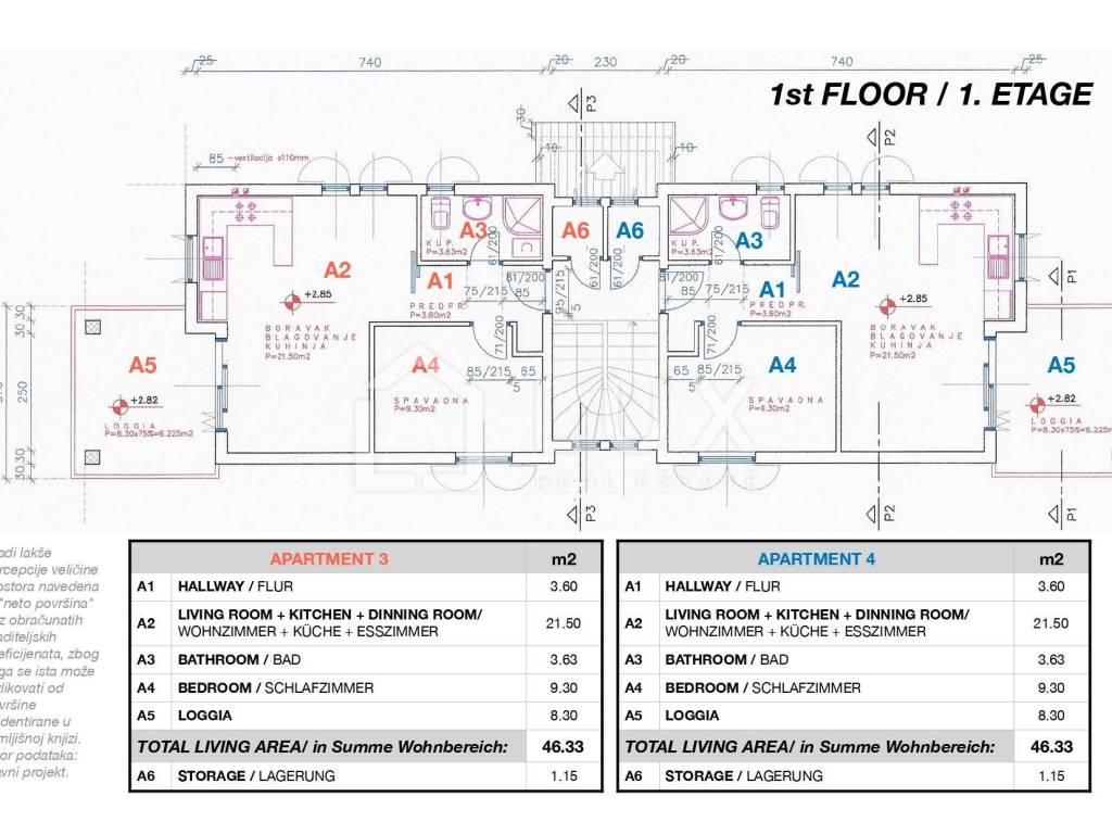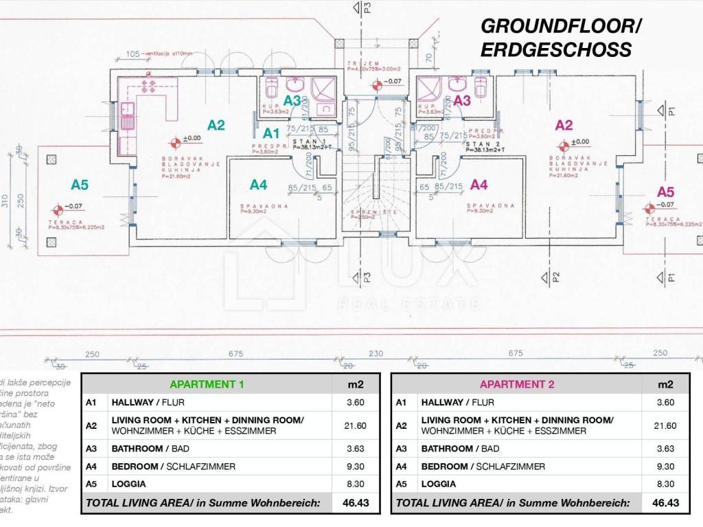 Nekretnina je podijeljena na 4 u potpunosti opremljena apartmana. Prizemlje se sastoji od dva apartmana svaki sa kuhinjom, blagovaonom, dnevnim boravkom, kupaonom, jednom spavaćom sobom i terasom. Isti raspored proteže se i na 1. katu.