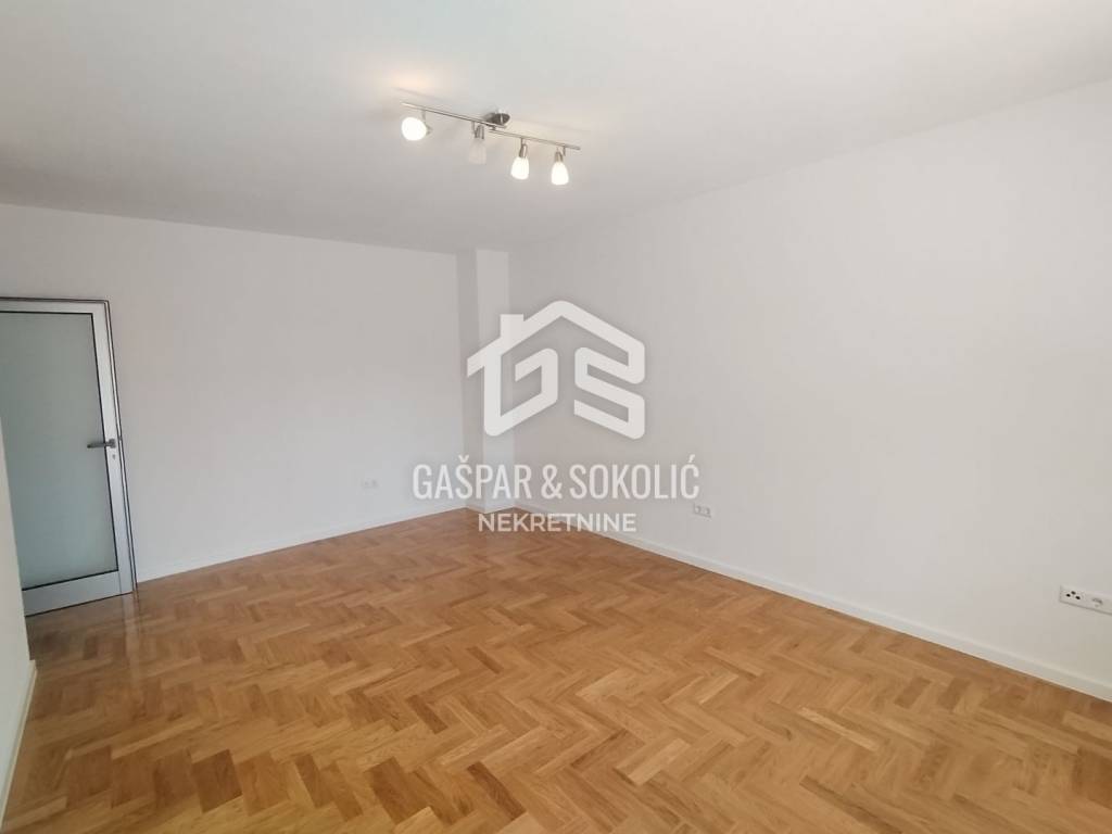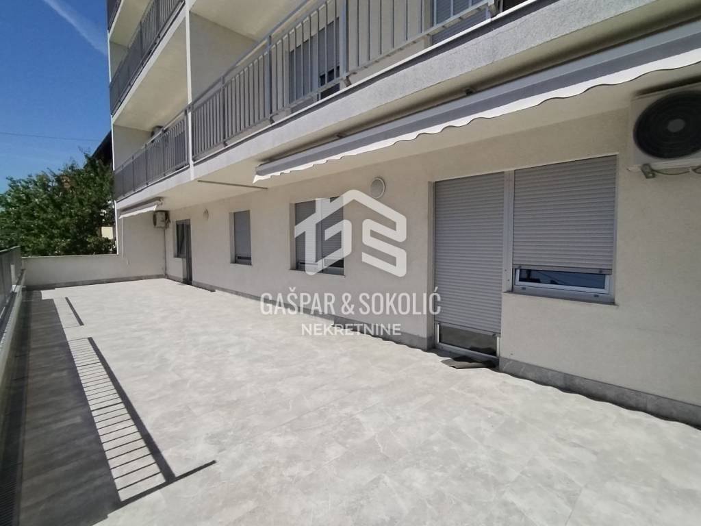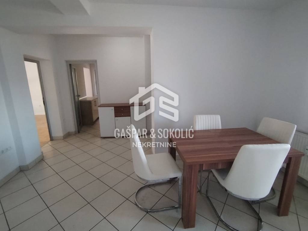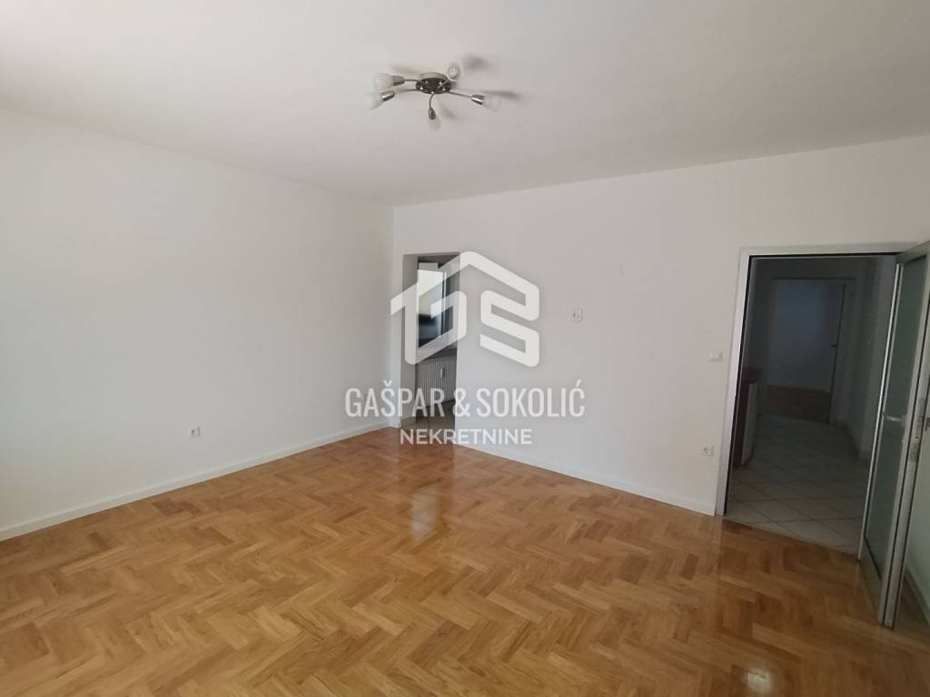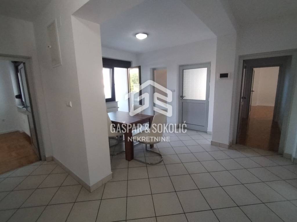 Stan u prizemlju površine je 157,16m2 neto (površina bez koeficijenata iznosi 219,18m2). Stan se sastoji od 3 odvojene cjeline koje predstavljaju poslovnu priliku i dodatnu vrijednost. Stan je koncipiran kao prostran četverosobni stan koji se može koristiti za namjenu stanovanja, a može se koristiti jednim dijelom za stanovanje, a drugim kao poslovni prostor za tihu djelatnost (odvjetnički ured, računovodstvo i slično). U stan se može ući kroz dvoja ulazna vrata, pa je korištenje kao dvije nekretnine jednostavno izvedivo. Ulaz u drugi pripadak stana je iz stubišta - mala garsonijera sa kuhinjom i kupaonicom. Treći pripadak stana -spremište (u etažnom elaboratu) ulaz također iz stubišta, a može se koristiti kao mali poslovni prostor, s obzirom da ima prozore i balkon.